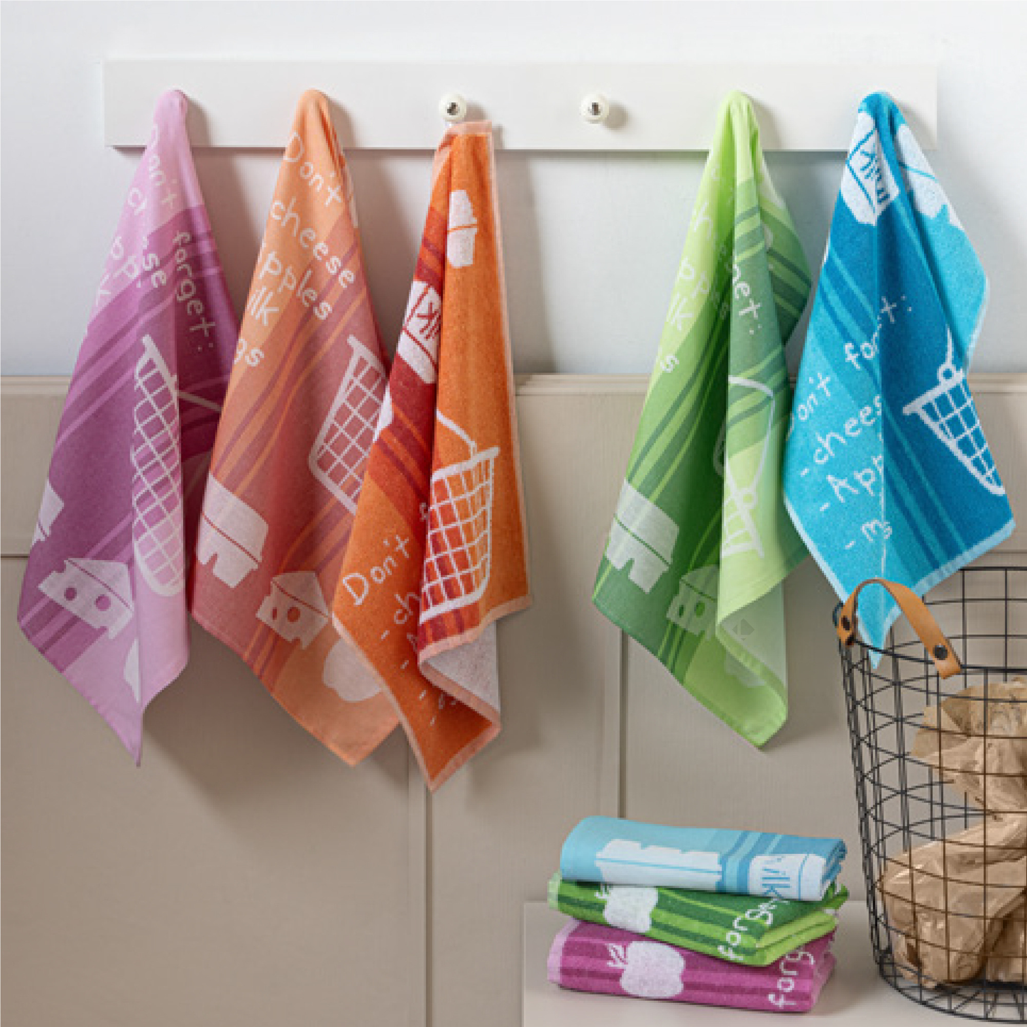 Parce que la liste des courses finit toujours griffonnée sur un bout de papier oublié sur la table, les torchons de la Collection Basket s'imposent comme un pense-bête aussi malin que déco. Affichant un design inspiré du quotidien, ils jouent avec les incontournables du panier de courses : "Don't forget cheese, apples, milk"... Une manière amusante de donner du caractère à votre cuisine tout en restant pratique.