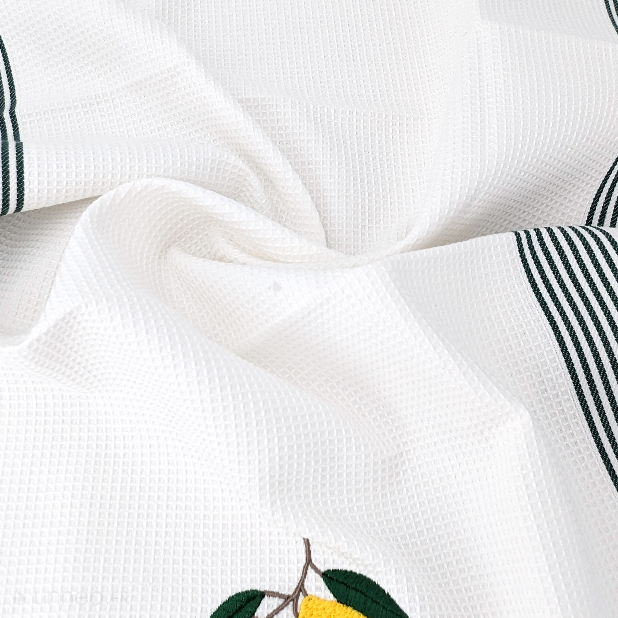 | Plus produit | Torchon de cuisine 50x70 cm WAFFLE BRODÉ blanc avec filet vert et broderie citron, nid d'abeille aspect gaufré 100% coton 260 g/m2 - Fabriqué au Portugal |