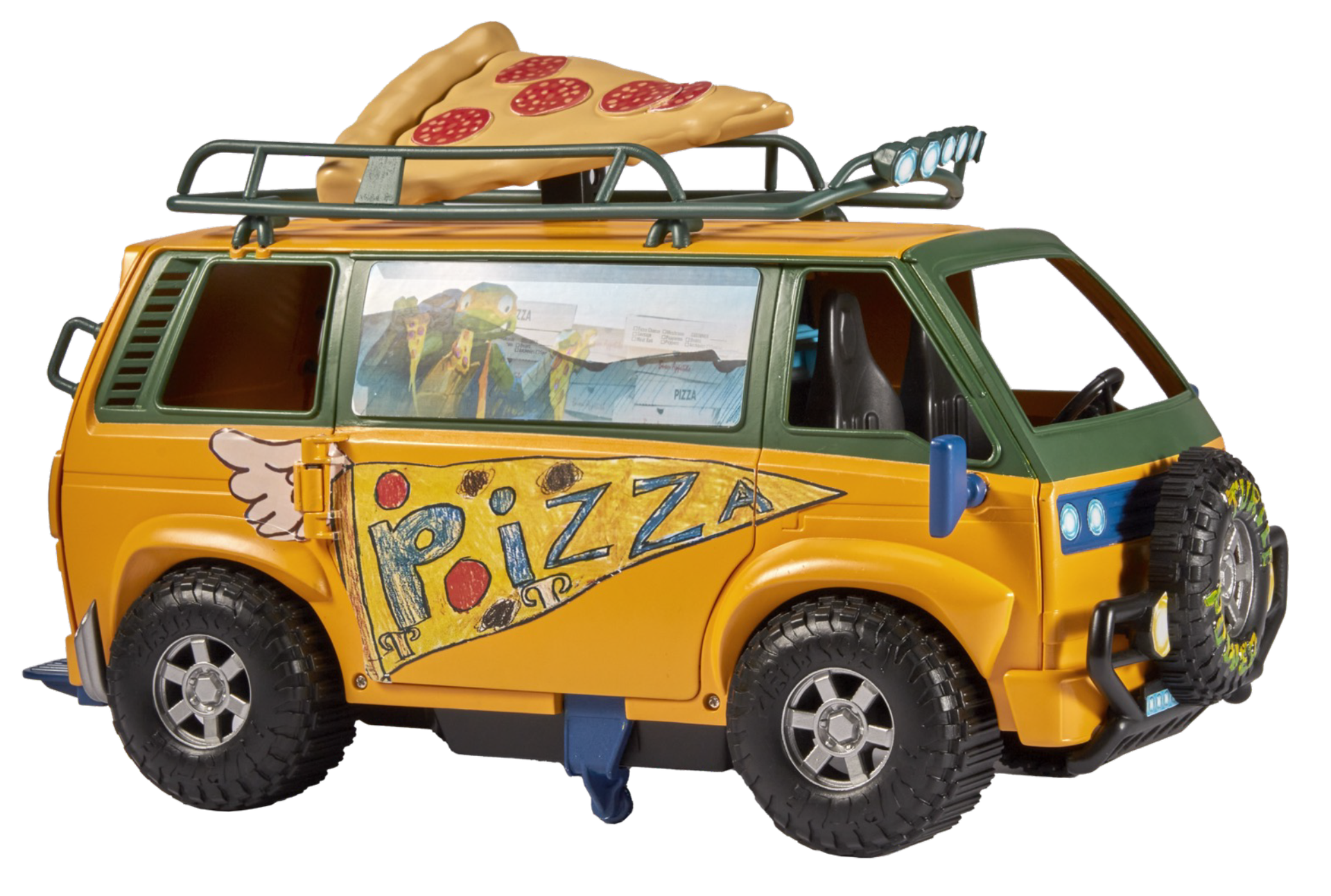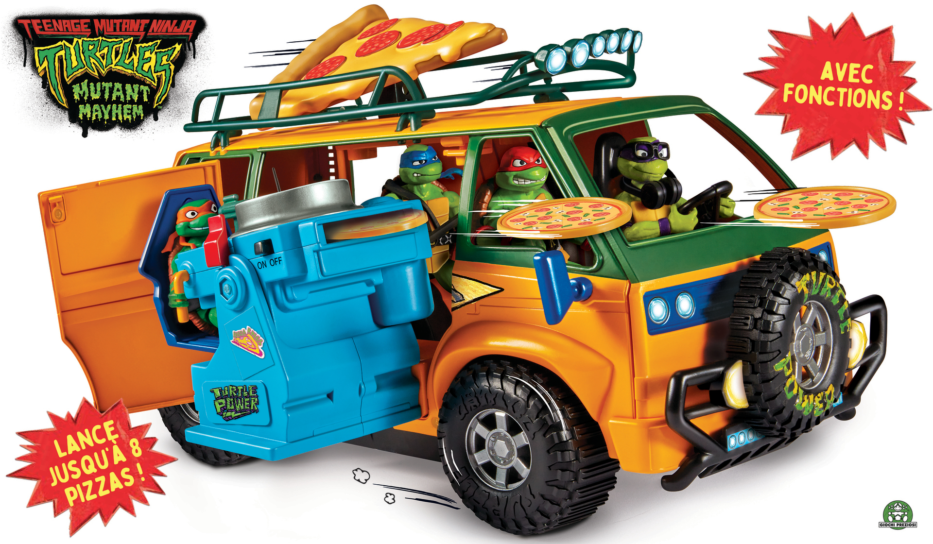 "Camion des tortues ninja du film avec plusieurs fonctions. Dont une fonction : lance pizza motorisé. Le camion peut accueillir les figurines articulée 12 cm Tortues ninja."