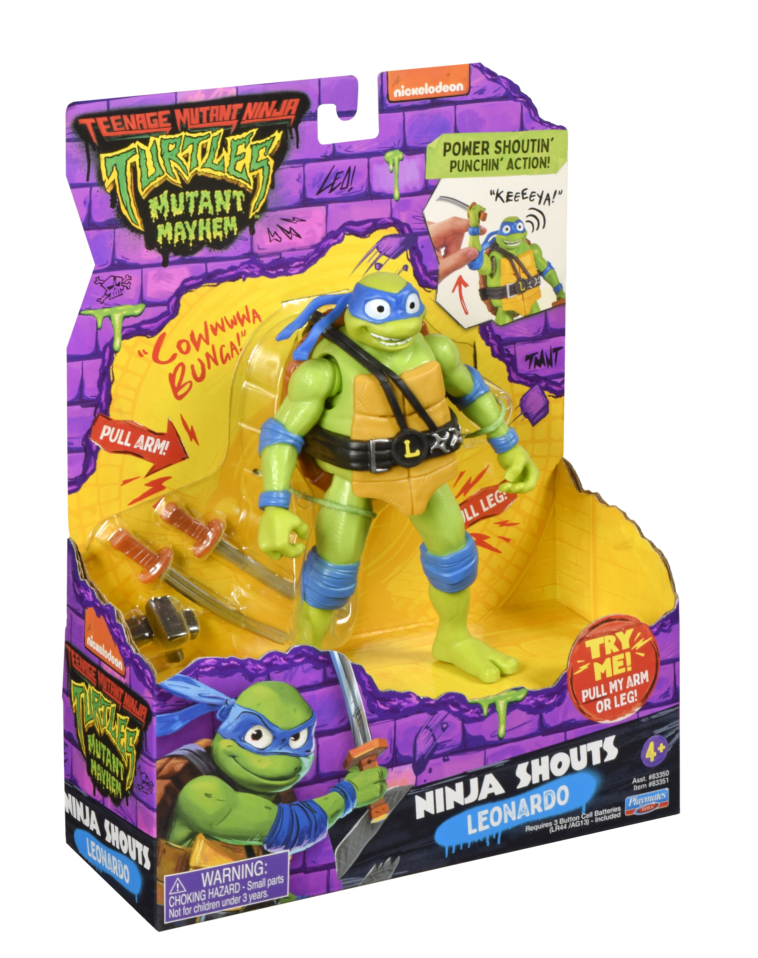 Plus produit LICENCE : Produit officiel TORTUES NINJA ELECTRONIQUE : Avec sons pour chaque attaque FONCTION : Tire sur le bras ou la jambe de ta figurine pour activer les effets sonores. ACCESSOIRE : Avec son arme signature TAILLE : 15 cm AGE : Pour les enfants à partir de 4 ans PILES INCLUSES : 3 piles LR44 incluses.