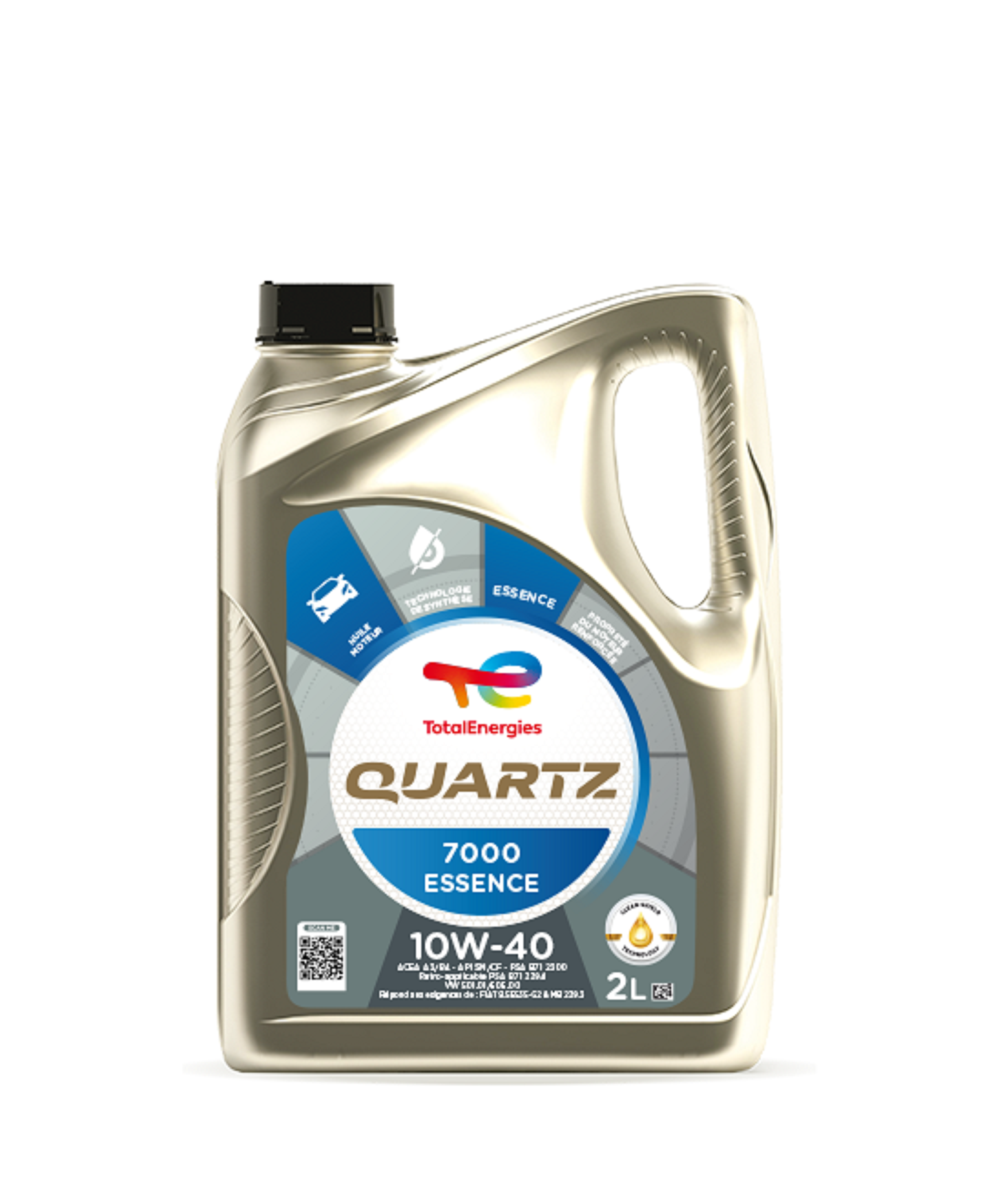 Quartz 7000 essence 10W-40 répond aux normes internationales ACEA A3/B4 ; API SN/CF, est homologué PSA B71 2300 (rétro applicable PSA B71 2294),VOLKSWAGEN VW50.01/505.00 et satisfait les exigences techniques de MERCEDES-BENZ MB 229.3, FIAT 9.55535-G2. Semi-synthéthique, Quartz 7000 essence 10W-40 est parfaitement adapté aux motorisations turbo-compressées et multisoupapes et convient à tous les véhicules essence sans filtre à particules, commercialisés avant les années 2000. Cette huile moteur a été développée pour les moteurs essence de véhicules de tourisme et utilitaires légers et pour les moteurs équipés de pots catalytiques. Quartz 7000 essence 10W-40 est parfaitement adapté à une conduite normale sur route (peu de ville), assure une protection durable des pièces les plus sensibles du moteur contre l’usure (usure distribution, usure segment, piston, chemise) et garantit une bonne propreté du moteur.TotalEnergies Quartz avec la technologie Clean-Shield maintient les moteurs propres à long terme grâce à des molécules détergentes avancées conçues pour capturer et isoler les saletés telles que les boues et la suie.