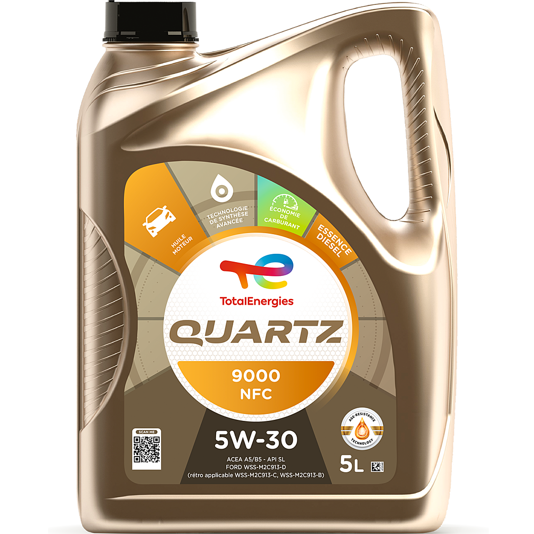 Quartz 9000 NFC 5W-30 répond aux normes internationales ACEA A5/B5 ; API SL/CF, est homologué FORD WSS-M2C913-D (rétro applicable WSS-M2C913-C, WSS-M2C913-B), JAGUAR LAND ROVER STJLR.03.5003 et convient pour les spécifications FIAT 9.55535-G1 et FIAT 9.55535-N1.100 % synthétique, Quartz 9000 NFC 5W-30 est parfaitement adapté aux moteurs essence et Diesel, même les plus récents, équipés de système de post-traitement des véhicules FORD. Cette huile moteur est particulièrement adaptée aux motorisations turbo-compressées et multisoupapes et satisfait aux conditions d'utilisation les plus difficiles (autoroute, circulation urbaine intense...) en toutes saisons. Quartz 9000 NFC 5W-30 réduit l’impact environnemental et la consommation de carburant : 3% de gain de consommation de carburant (résultat à l’essai normalisé ACEA M111 FE). Quartz 9000 NFC 5W-30 assure une protection et une propreté optimale du moteur et facilite les démarrages à froid.TotalEnergies Quartz avec la technologie Age-Resistance offre une protection moteur imbattable. Sa combinaison unique de molécules hyperactives crée un film d'huile épais et résistant sur toutes les pièces de moteur concernées.