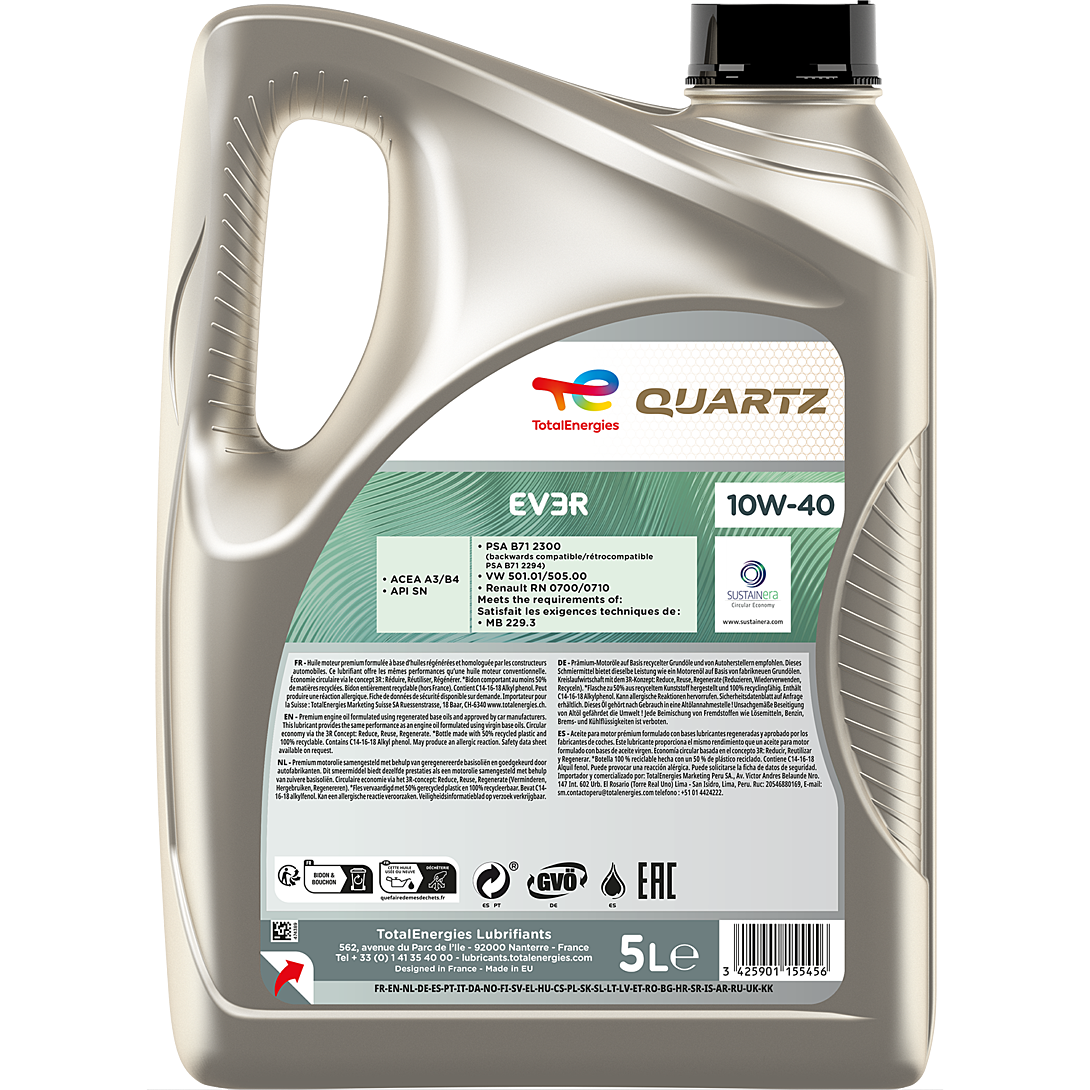 Quartz EV3R 10W40 5L est une huile moteur éco-conçue* de technologie synthétique et conçue avec des huiles de base 100% régénérées** pour les moteurs essence et diesel. Approuvé par de nombreux constructeurs automobiles, ce lubrifiant premium à économie circulaire a été développé selon le concept 3R et offre les mêmes performances que les huiles moteur Quartz standard.
