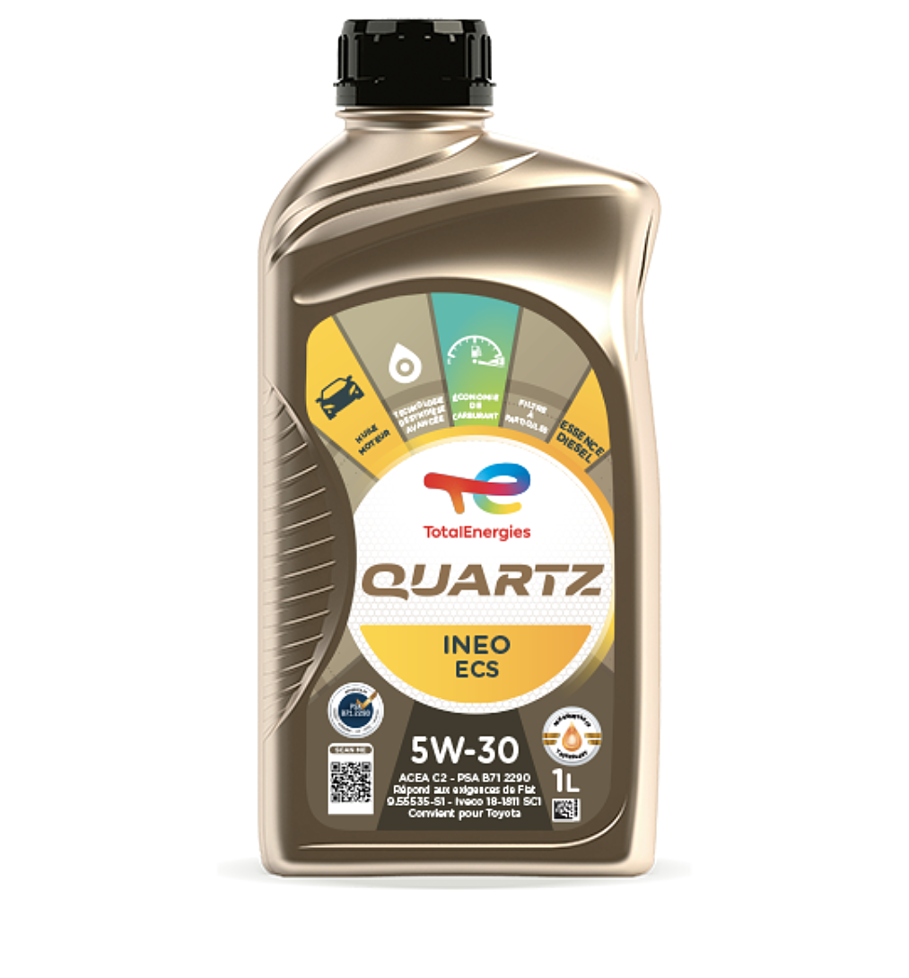 Quartz Ineo ECS 5W-30 répond à la norme internationale ACEA C2, est homologué PSA B71 2290 (PEUGEOT, CITROEN, DS) et satisfait les exigences techniques FIAT 9.55535-S1 ; IVECO 18-1811 SC1. 100 % synthétique, Quartz Ineo ECS 5W-30 est spécialement conçu pour les moteurs PEUGEOT, CITROËN et DS. Particulièrement adapté à tous les moteurs Diesel, anciens comme récents et à la plupart des moteurs essence, Quartz Ineo ECS 5W-30 satisfait les cycles d’entretien les plus sévères et les conditions d'utilisation les plus difficiles (autoroute, circulation urbaine intense...), quelque soit la saison. Cette huile moteur garantit une longévité du filtre à particules et respecte l’environnement grâce à une réduction des émissions de CO2 et des émissions polluantes. Quartz Ineo ECS 5W-30 assure une protection et une propreté optimale du moteur et réduit la consommation de carburant : jusqu’à 6 % d’économies de carburant en phase de démarrage, en moyenne 2,5% d’économies de carburant en cycle mixte par rapport à l’utilisation d’une huile de référence ACEA (tests effectués sur une Citroën C4 1.6 HDi). TotalEnergies Quartz avec la technologie Age-Resistance offre une protection moteur imbattable. Sa combinaison unique de molécules hyperactives crée un film d'huile épais et résistant sur toutes les pièces de moteur concernées.