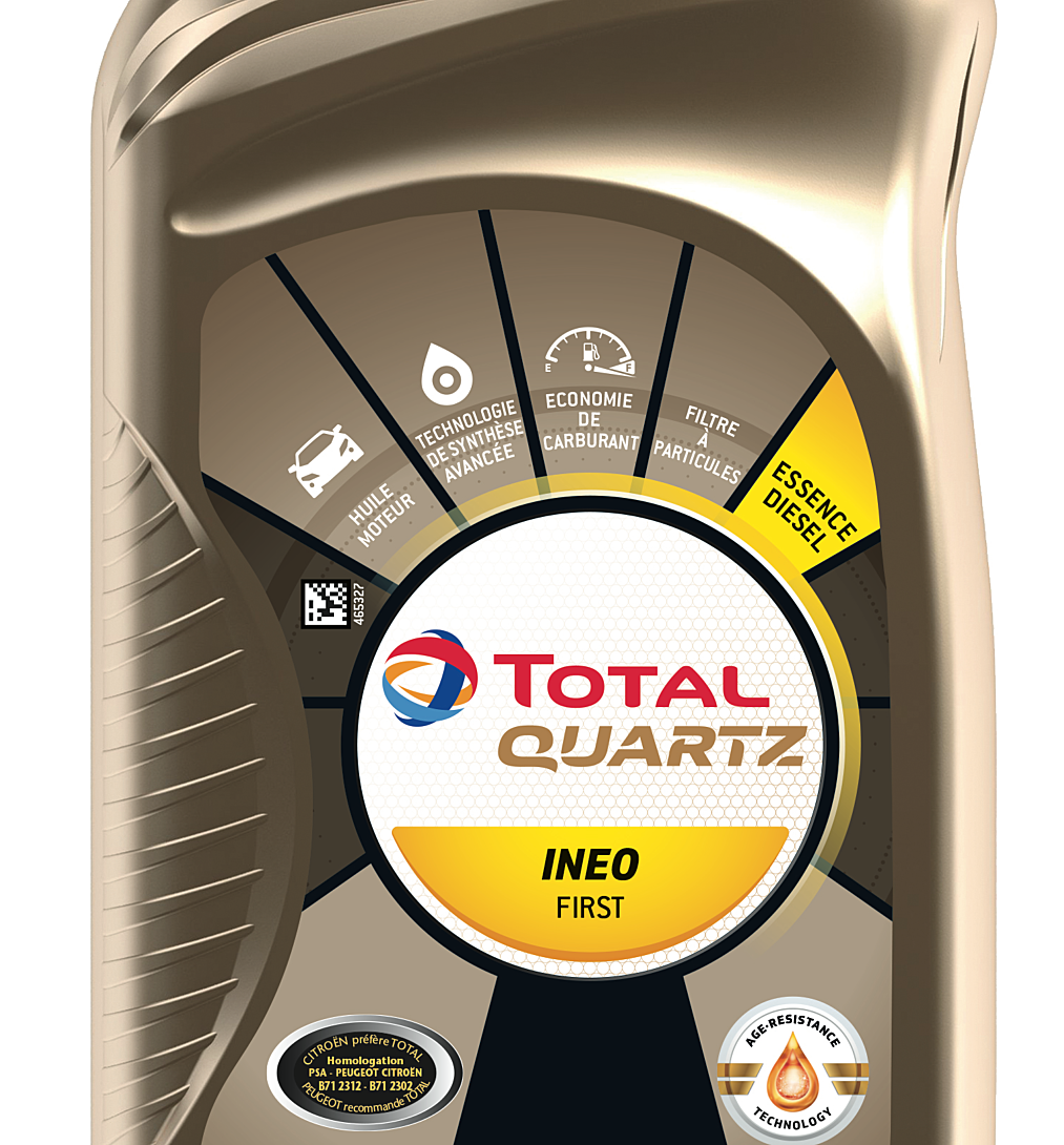 Quartz Ineo First 0W-30 répond aux normes internationales ACEA C2; API SN Plus, est homologué PSA B71 2312 & 2302 (PEUGEOT, CITROEN, DS) et satisfait les exigences JAGUAR LAND ROVER STJLR.03.5007 ; FIAT 9.55535-DS1 ,FIAT 9.55535-GS1. 100% synthétique, Quartz Ineo First 0W-30 est utilisé par PSA PEUGEOT CITROËN en première monte et est recommandé par PEUGEOT, CITROËN et DS en après-vente. Cette huile moteur est particulièrement adaptée aux moteurs récents équipés de technologies PSA e-HDI, des systèmes Stop & Start et de motorisations hybrides, qui exigent un lubrifiant de toute nouvelle génération.Quartz Ineo First 0W-30 convient aux conditions d’utilisation les plus sévères (porte-à-porte, conduite sportive, démarrage répétés, ville, autoroute…) et réduit l'impact environnemental et la consommation de carburant : 3,33% de gain de consommation de carburant (résultat à l’essai normalisé ACEA M111 FE). Quartz Ineo First 0W-30 protège les systèmes anti-pollution, assure la protection et la propreté du moteur et facilite les démarrages à froid. TotalEnergies Quartz avec la technologie Age-Resistance offre une protection moteur imbattable. Sa combinaison unique de molécules hyperactives crée un film d'huile épais et résistant sur toutes les pièces de moteur concernées.