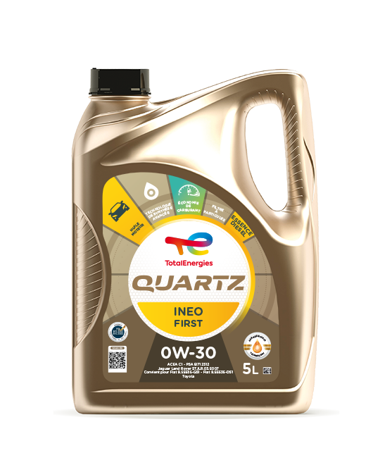 Quartz Ineo First 0W-30 répond aux normes internationales ACEA C2; API SN Plus, est homologué PSA B71 2312 & 2302 (PEUGEOT, CITROEN, DS) et satisfait les exigences JAGUAR LAND ROVER STJLR.03.5007 ; FIAT 9.55535-DS1 ,FIAT 9.55535-GS1. 100% synthétique, Quartz Ineo First 0W-30 est utilisé par PSA PEUGEOT CITROËN en première monte et est recommandé par PEUGEOT, CITROËN et DS en après-vente. Cette huile moteur est particulièrement adaptée aux moteurs récents équipés de technologies PSA e-HDI, des systèmes Stop & Start et de motorisations hybrides, qui exigent un lubrifiant de toute nouvelle génération.Quartz Ineo First 0W-30 convient aux conditions d’utilisation les plus sévères (porte-à-porte, conduite sportive, démarrage répétés, ville, autoroute…) et réduit l'impact environnemental et la consommation de carburant : 3,33% de gain de consommation de carburant (résultat à l’essai normalisé ACEA M111 FE). Quartz Ineo First 0W-30 protège les systèmes anti-pollution, assure la protection et la propreté du moteur et facilite les démarrages à froid. TotalEnergies Quartz avec la technologie Age-Resistance offre une protection moteur imbattable. Sa combinaison unique de molécules hyperactives crée un film d'huile épais et résistant sur toutes les pièces de moteur concernées.