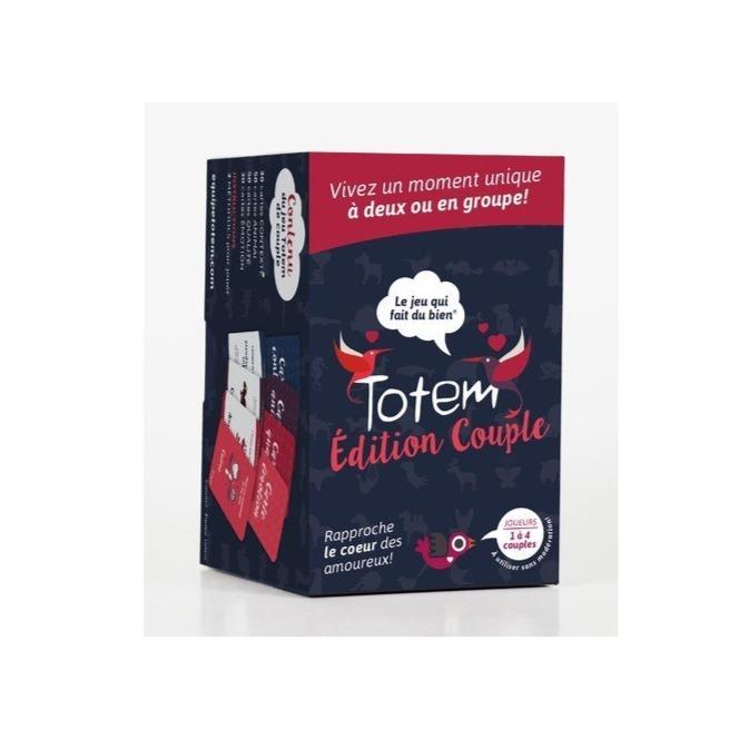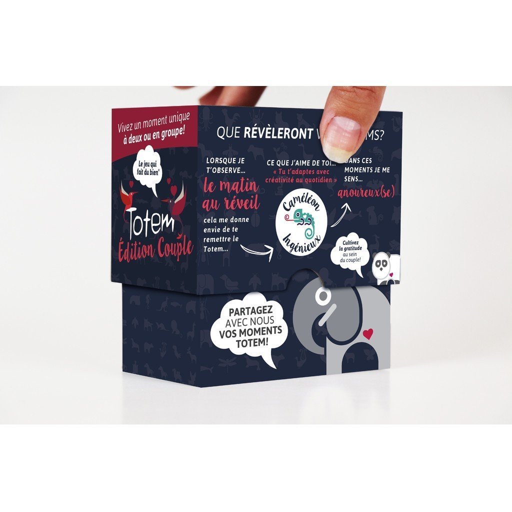 à partir de 18 ans 30 min à 1 heure 3 à 6 joueur(s) Le jeu Totem Édition Couple permet de vivre un moment authentique à 2 ou de créer une expérience de groupe inspirante ! Préparez-vous à recevoir une vague d'amour dont chacun se souviendra longtemps.Dans Totem, les joueurs se révèlent mutuellement leurs forces et leurs qualités en formant des totems, des combinaisons d'une carte animal (représentant une force) et d'une carte qualité. Chaque joueur contribue avec une carte animal et une carte de qualité au totem de l'autre joueur.Totem Couple propose 3 modes de jeu. Totem intime pour 2 personnes.Pour chaque partenaire pour 2 à 4 couples, Au sein de chacun des couples, il y a un receveur et un donneur.Pour chaque couple pour 2 à 4 couples, Découvrez et entendez ce que les autres apprécient de votre couple.Le jeu se termine quand tout le monde a un totem.Le joueur avec le plus de points à la fin du jeu gagne, mais tous les autres gagnent aussi quelque chose : une plus grande conscience de la façon dont les autres les perçoivent et les apprécient !