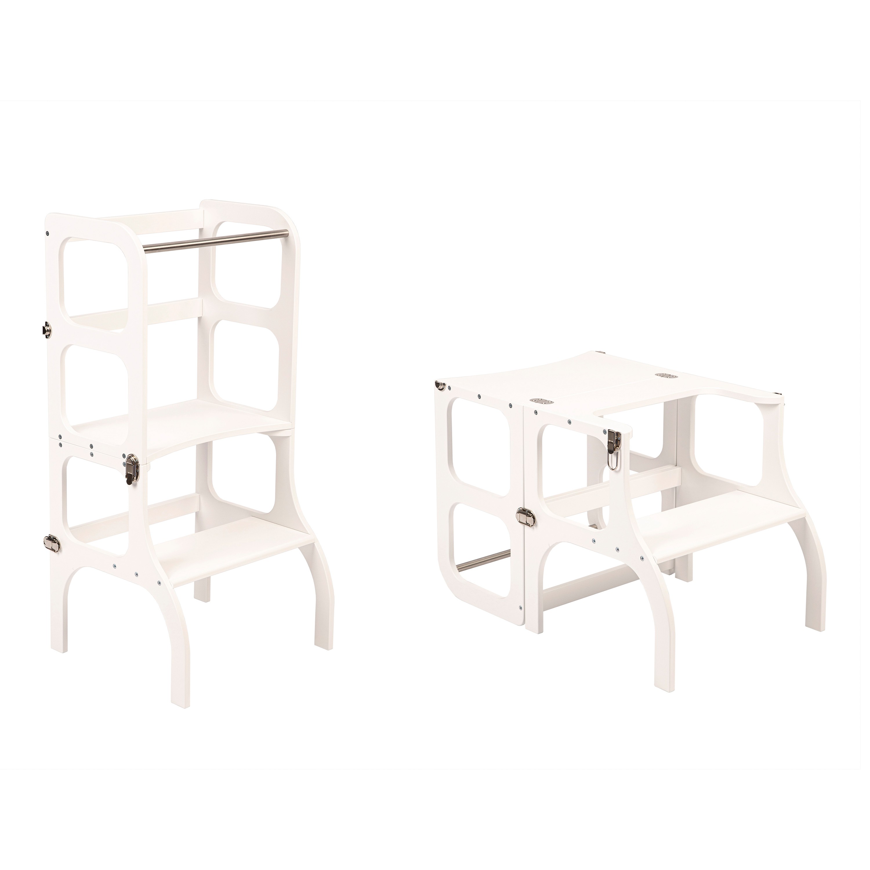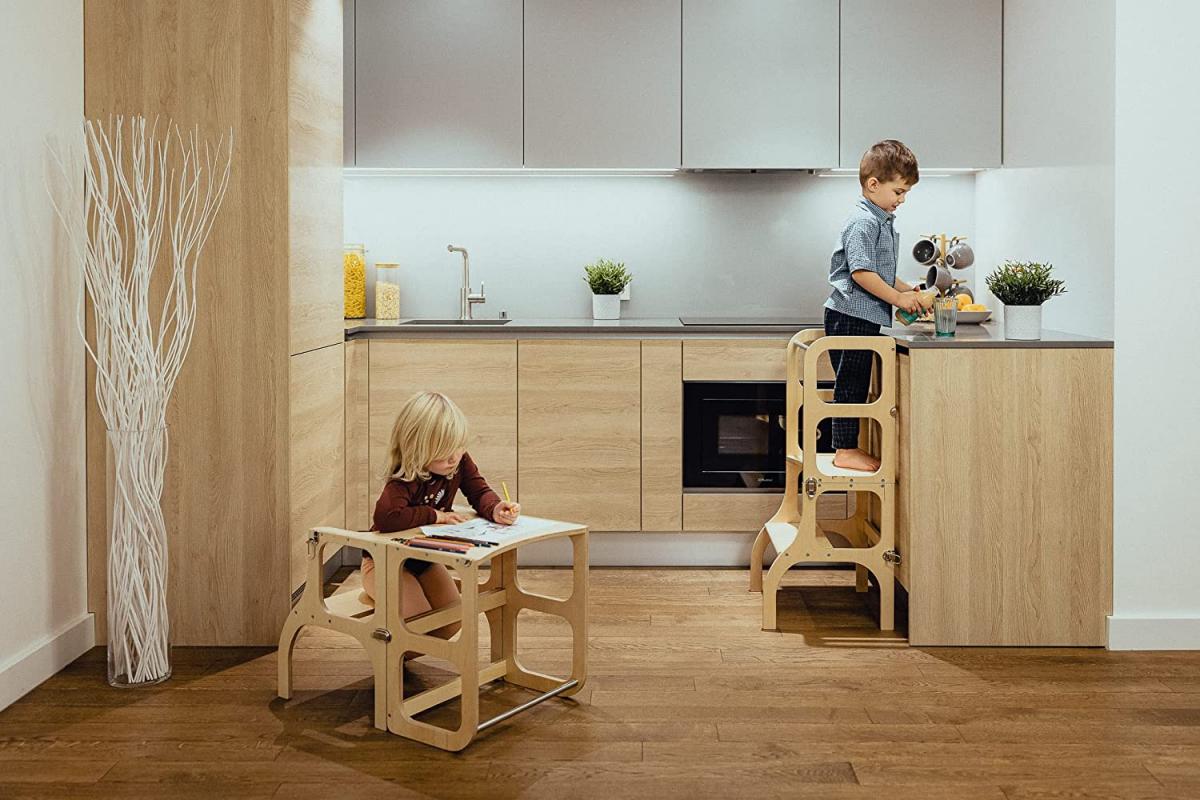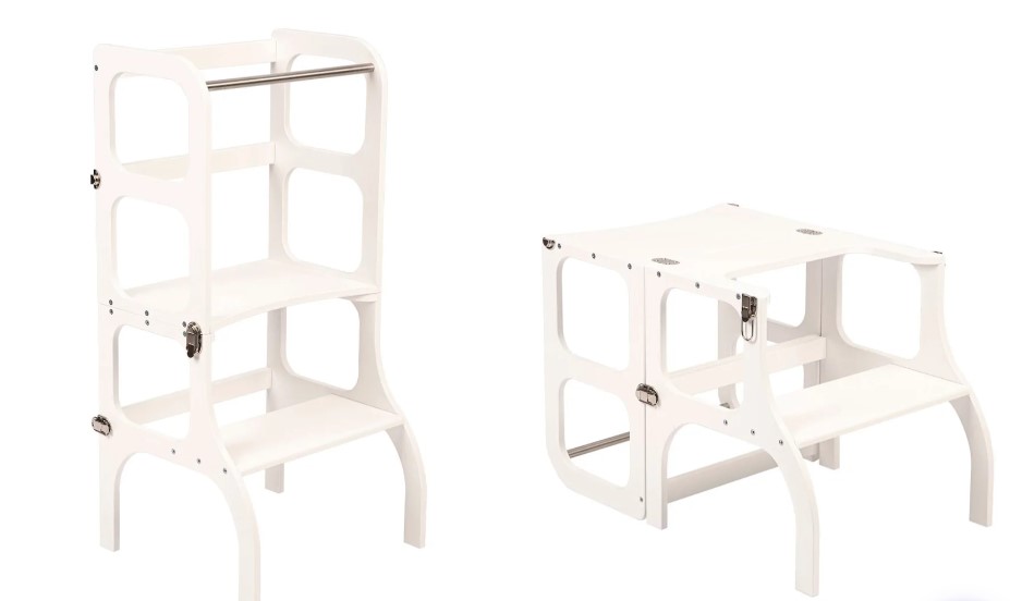 La conception de la tour d'assistance est basée sur le principe de base de la pédagogie Montessori pour développer l'indépendance de l'enfant et son implication dans les tâches quotidiennes. La tour d'aide conVERTible ne prend pas beaucoup de place et combine deux meubles pour enfants nécessaires en un seul.