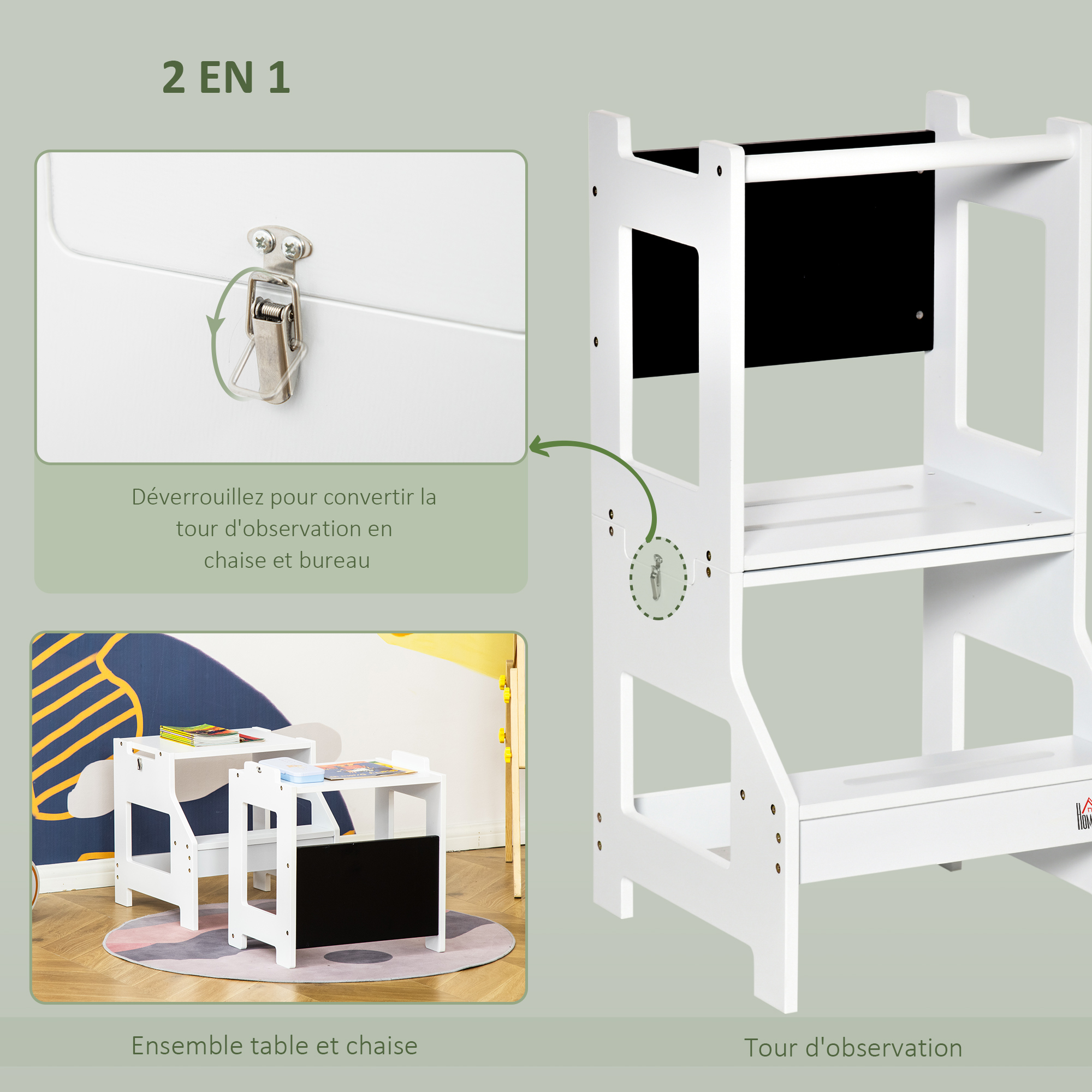 Tour d'apprentissage tableau à craie tabouret bureau 3 en 1 - marches antidérapantes, barreau, hauts rebo