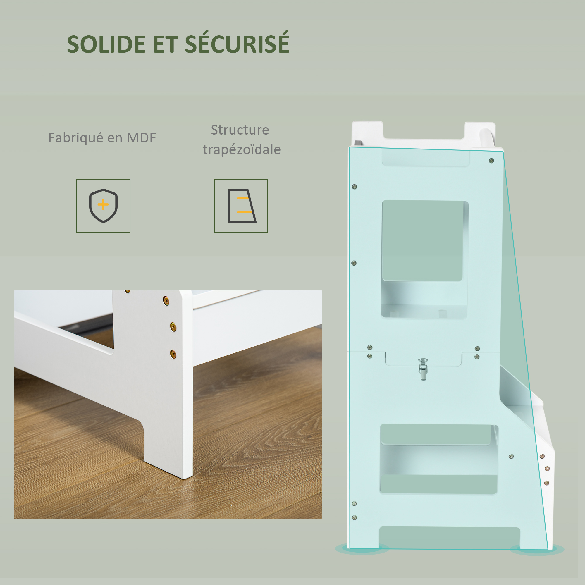 - Conception, fabrication de qualité en MDF classe E1 robuste de forme trapézoïdale : stabilité optimum