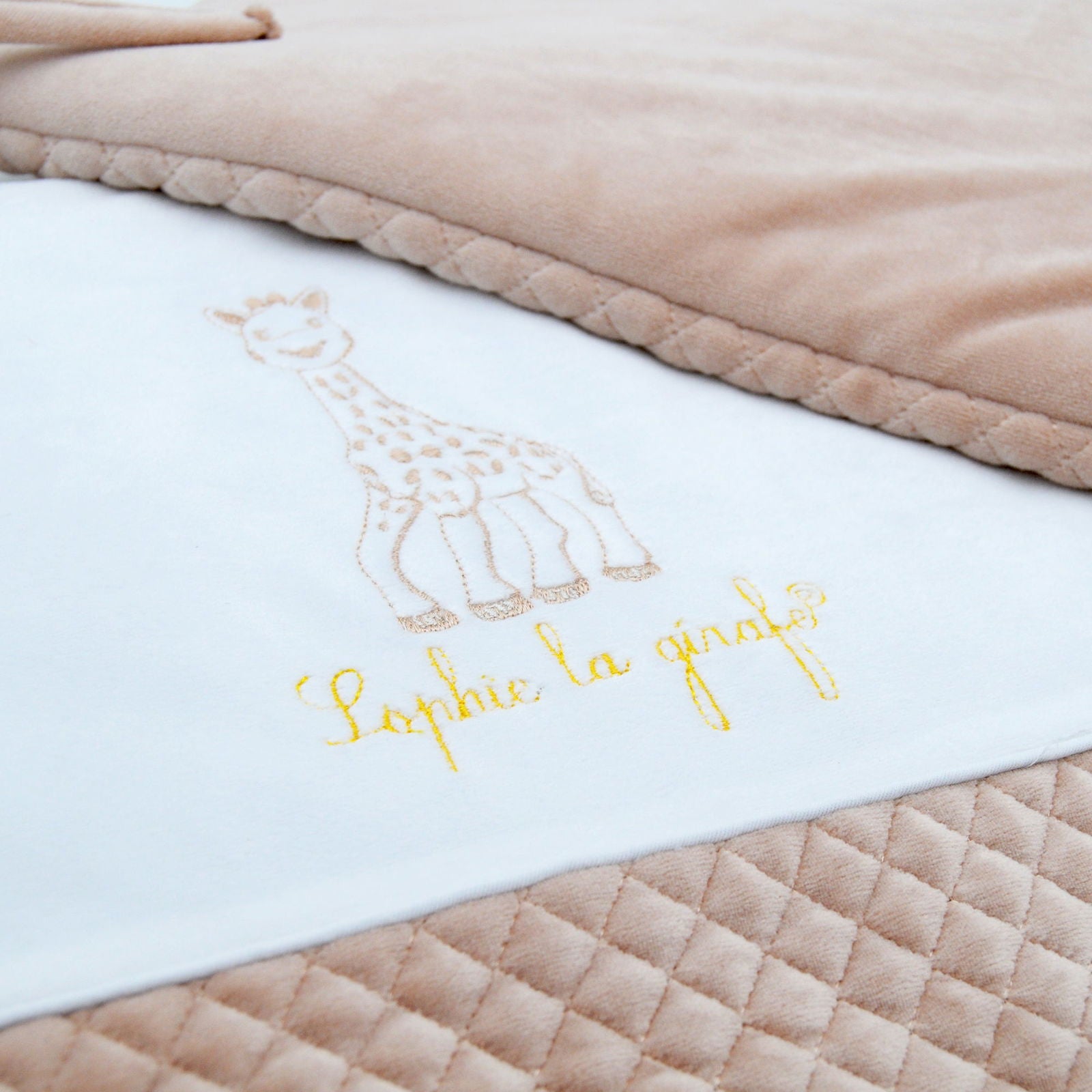 Tour de lit adaptable en velours matelassé brodé de notre collection Sophie la Girafe Paris.