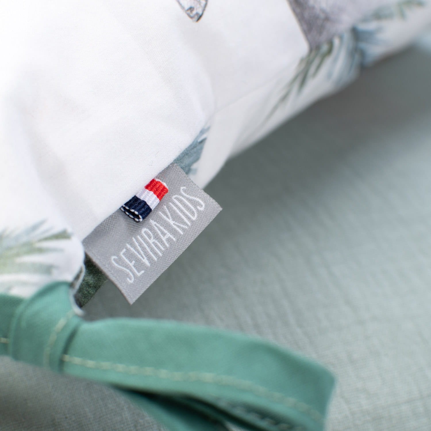 Son design délicat et coloré, orné d'imprimés d'animaux et de palmiers, évoque de belles aventures pour accompagner les doux sommeils de votre enfant. Ce linge de lit moderne à l'esprit jungle est sublimé par un joli liseré vert d'eau qui borde le tour de lit tout en garantissant un confort optimal.Caractéristiques principales- Réversible : changez de côté selon vos envies grâce à sa double face.