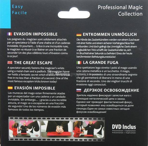 Les poignets du magicien sont solidement attachés par un spectateur à l'aide d'une chaine et d'un cadenas inviolable. Grâce à une icroyable ruse, le magicien va réussir à se libérer en une fraction de seconde ! Un des plus célébres tours d'évasion reconnu à ce jour.