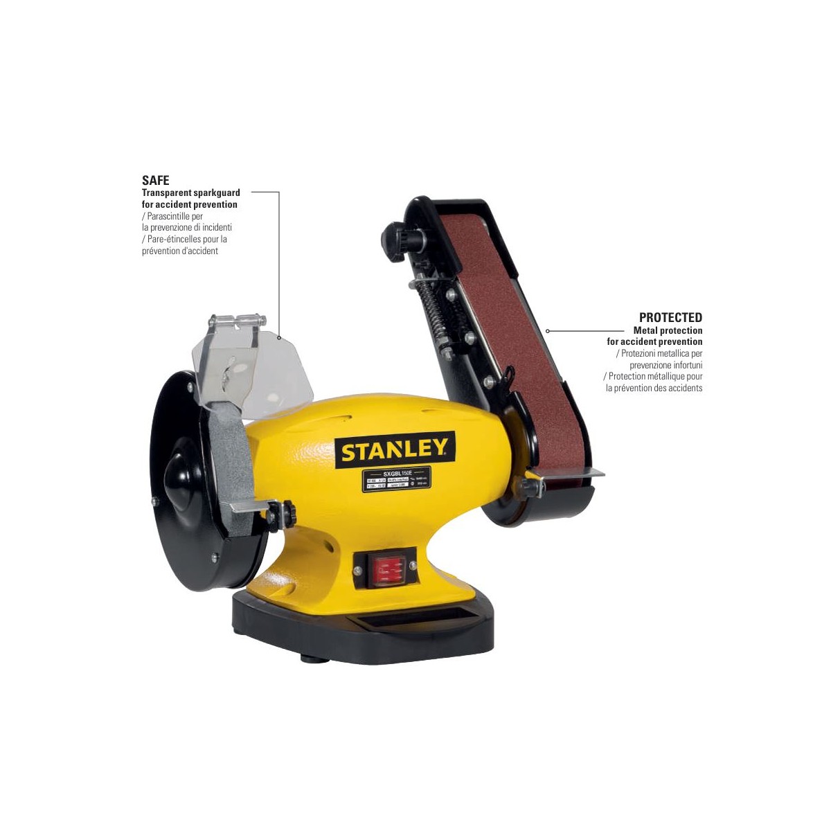 La meuleuse d'établi STANLEY SXGBL150E est équipée d'une meule de Ø 150mm avec grain de 36 et une bande abrasive de 50x690mm avec grain de 80, permettent de réaliser divers travaux de finition avec précision. Équipé d'un puissant moteur à induction silencieux qui produit une puissance double de 330 watts pour des performances optimales et s'adapte parfaitement à une multitude de travaux de finition, tels que le meulage, polissage, le ponçage et le dégrossissage.