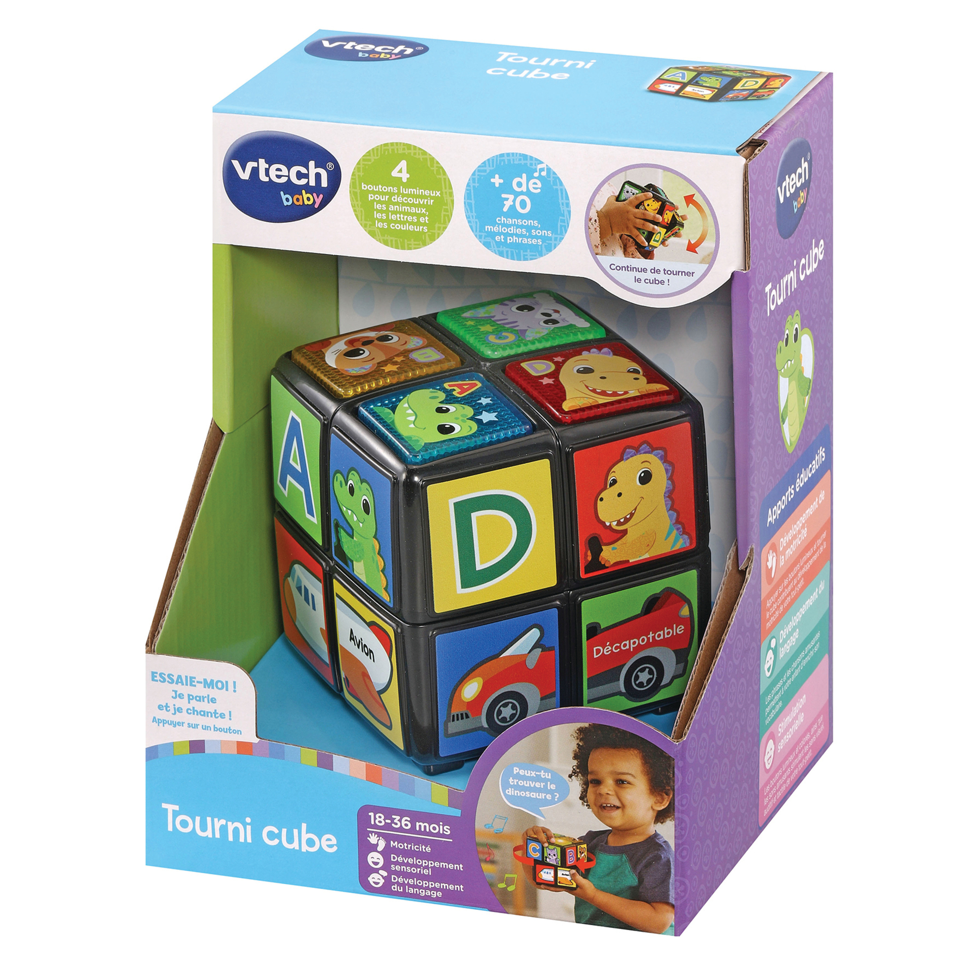 Tourni cube - 18 - 36 mois Un super cube avec des combinaisons différentes pour faire le plein de découvertes en s’amusant. 4 boutons lumineux interactifs sur le dessus du cube pour découvrir les premières lettres de l’alphabet, les animaux et les véhicules associés. Tourner le haut du cube pour transporter les animaux d’un véhicule à l’autre et jouer avec les différentes combinaisons. + de 70 chansons, mélodies, sons et phrases amusantes. Arrêt automatique. Boîte Try-me. Fonctionne avec 2 piles LR03 fournies.
