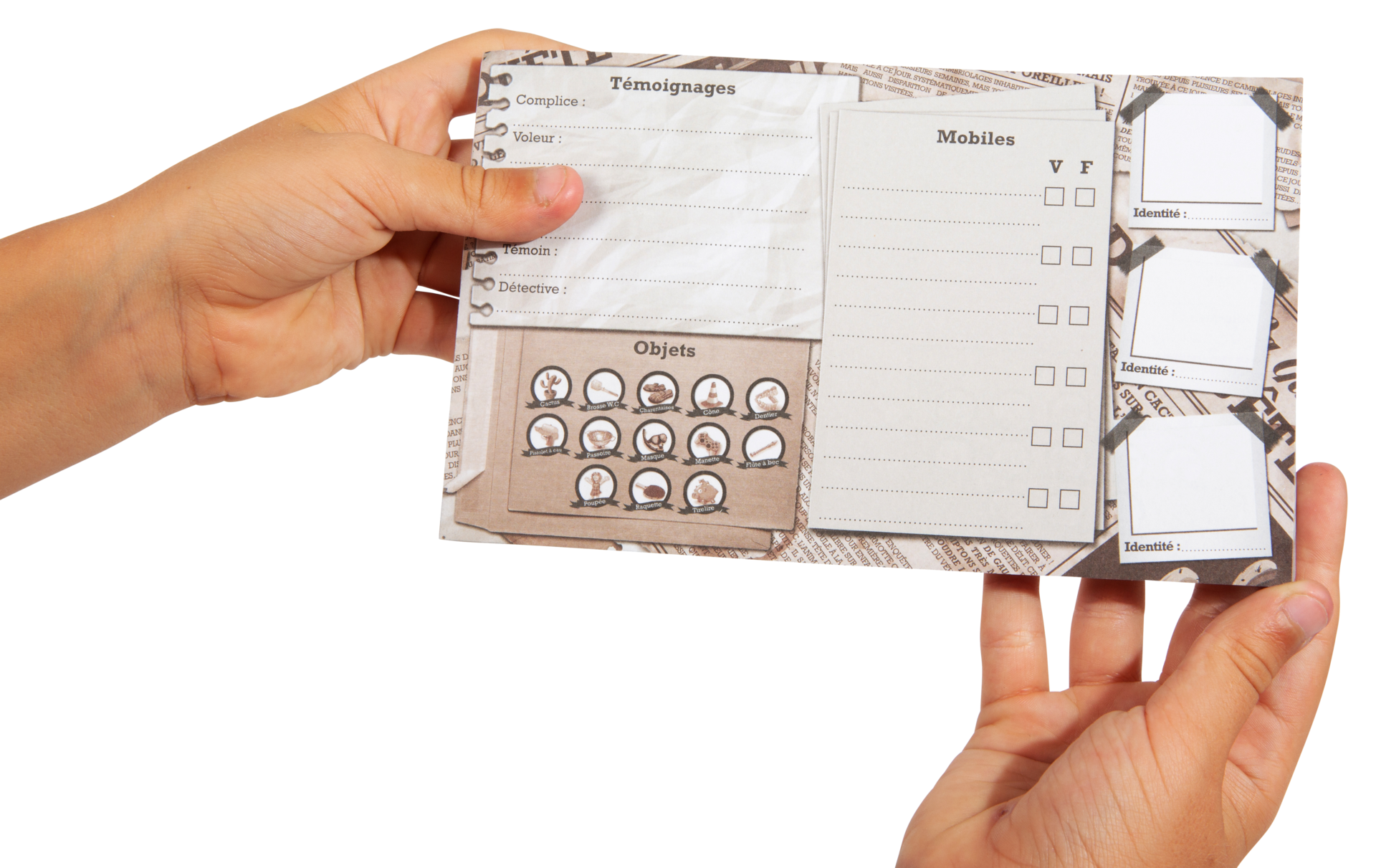 Menez l’enquête et découvrez les coupables des divers délits et crimes farfelus qui ont lieu à Enquêteville ! Soyez le premier à trouver le coupable, son mobile et l’objet mystère qui lui aura servi à commettre son crime à l’aide de portraits robots et de témoignages, mais attention aux indices sans fondements. Soyez attentifs à l’attitude des autres joueurs qui vous permettra de les démasquer !