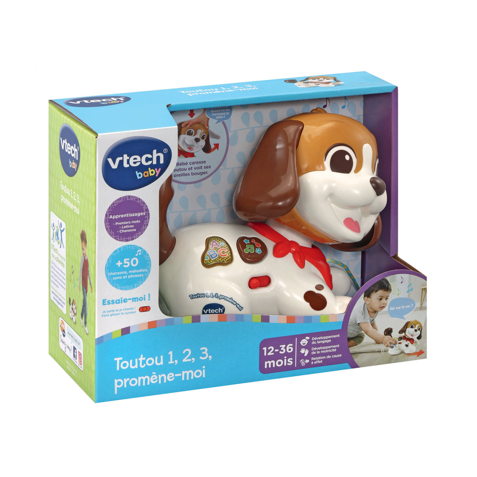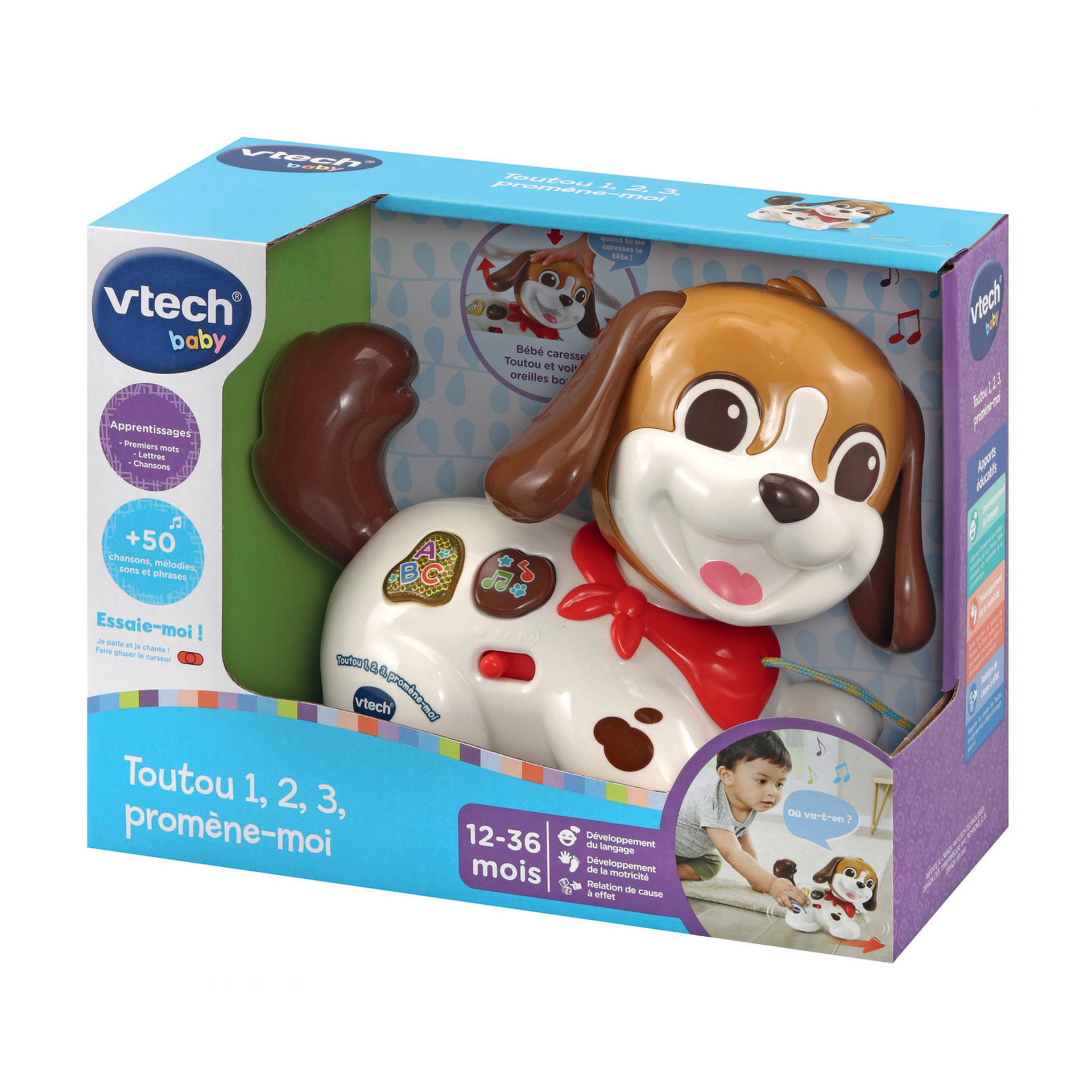 Toutou, 1,2,3 Promène-moi - 12 - 36 mois Un petit chien interactif tout mignon à câliner et à promener partout ! Lorsque Bébé fait rouler le petit chien avec la laisse, il déclenche des phrases et des sons amusants grâce au détecteur de mouvement. Il avance en se dodinant et en bougeant la tête pour inciter l’enfant à le suivre. 2 boutons lumineux permettent aux tout-petits de découvrir les premiers mots en écoutant des chansons, des mélodies et des anecdotes sur les chiots. Trop mignon, lorsque Bébé appuie sur la tête de Toutou, ses oreilles s’animent ! Trop rigolo, la queue de Toutou est pivotante. Bébé peut la faire tourner ! Rangement de la laisse dans le compartiment à piles. + de 50 chansons, mélodies, sons et phrases. Réglage du volume sonore et arrêt automatique. Boîte Try-me. Fonctionne avec 2 piles LR03 fournies.