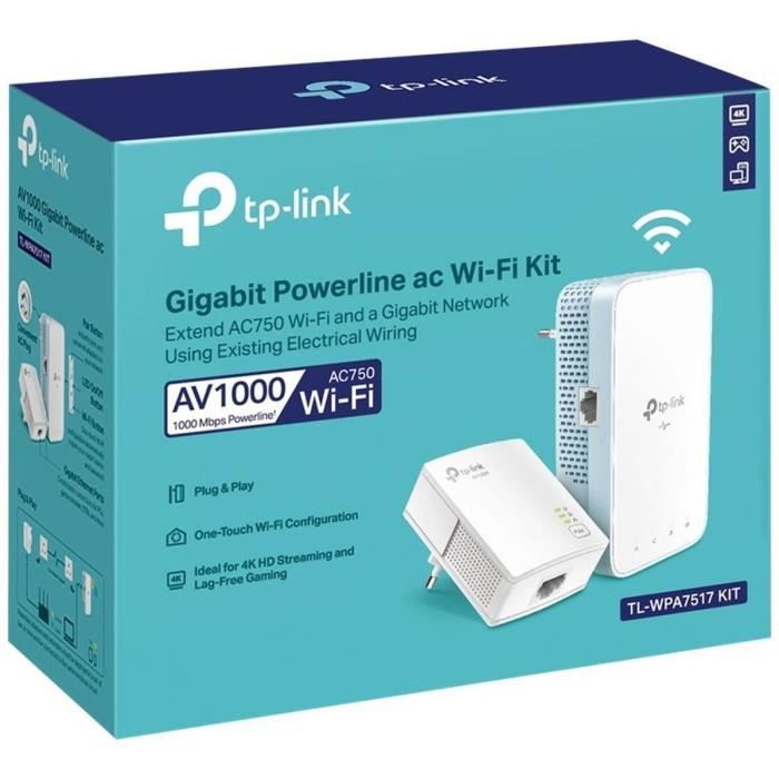 Kit de 2 CPL 1000Mbps Gigabit WIFI AC750 - TP-LINK TL-WPA7517 KITDébit CPL - Conforme au standard Homeplug AV2, offrant un débit maximal de 1000 Mbps, c'est l'idéal pour l'ensemble de vos besoins réseau et Internet.WiFi bi-bande 802.11AC Débit WiFi de 300 Mbps en 2.4 GHz et de 433 Mbps en 5 GHzWiFi Auto-Sync - Installation ultra simple grâce à la fonction Wi-Fi Clone et à la synchronisation des paramètre via WiFi Move.1 port Ethernet Gigabit pour offrir un accès Web haut débit à votre TV connectée, votre console de jeux, votre PC, etc.Facile à installer : branchez et utilisez. Aucune configuration requise.Compatible avec toutes les box du marché, et routeurs/points d'accès WiFi