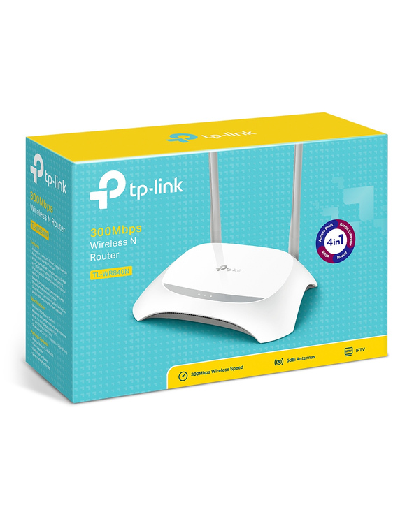 TP-LINK TL-WR840N. Bande Wi-Fi: Monobande (2,4 GHz), Norme Wi-Fi: Wi-Fi 4 (802.11n), Débit de transfert des données WLAN (max): 300 Mbit/s. Type d'interface LAN Ethernet: Fast Ethernet, Standards réseau: IEEE 802.11b,IEEE 802.11g,IEEE 802.11n,IEEE 802.3,IEEE 802.3u, LAN Ethernet : taux de transfert des données: 10,100 Mbit/s. Algorithme de sécurité soutenu: 128-bit WEP,64-bit WEP,WPA,WPA-PSK,WPA2,WPA2-PSK. Couleur du produit: Gris, Blanc. Type d'antenne: Externe, Niveau de gain de l'antenne (max): 5 dBi.