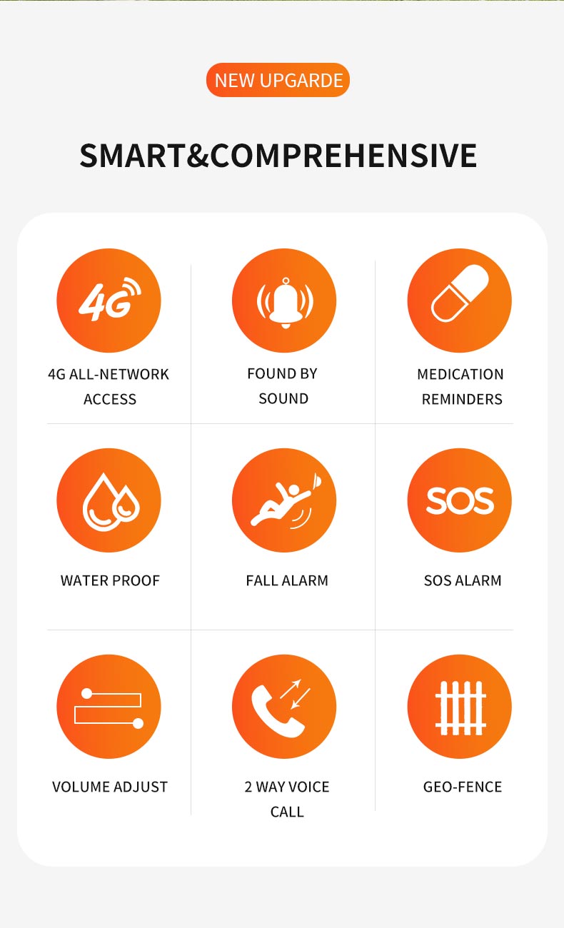 • Fonctions spéciales : surveillance à distance, appels bidirectionnels, détection de chute, fonctions de santé