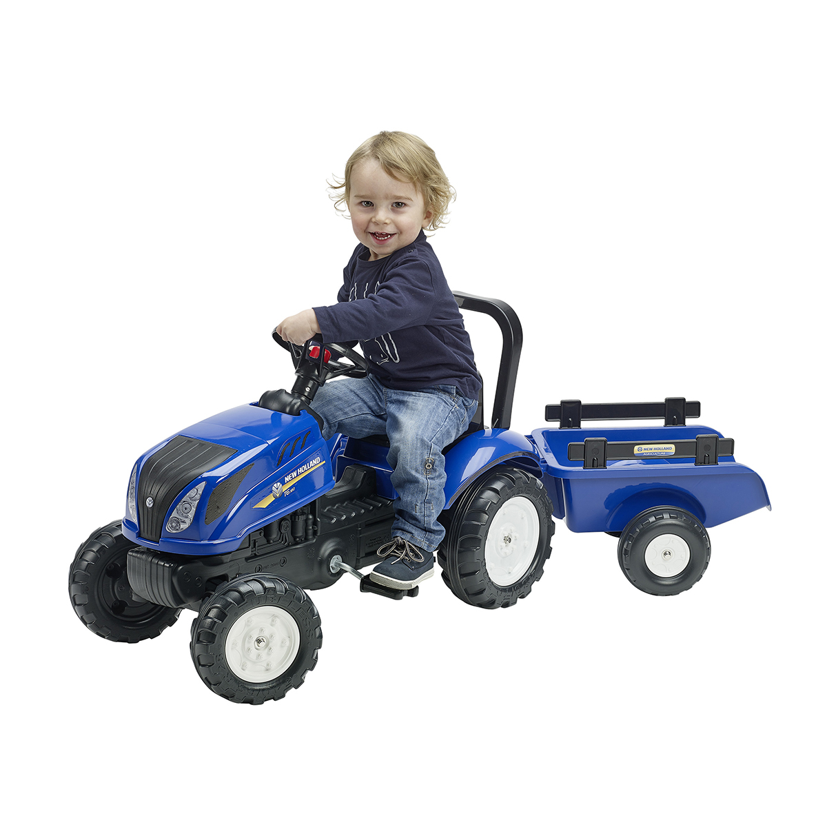 | Libellé | Tracteur à pédales Falk New Holland avec remorque - Bleu |