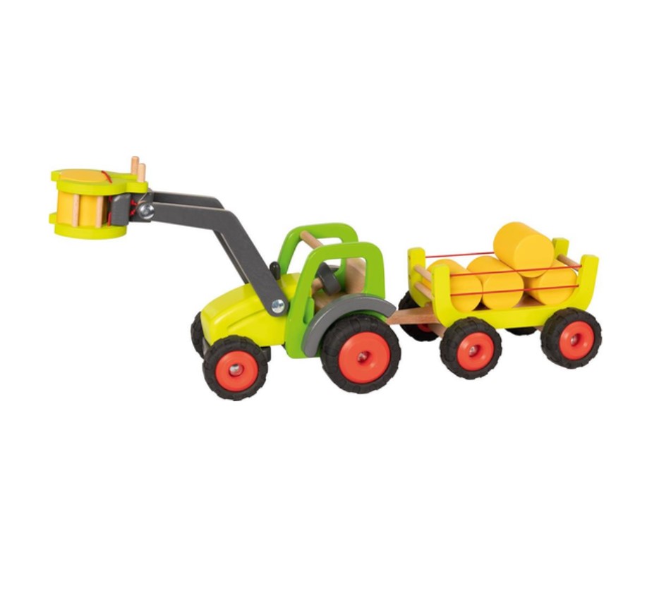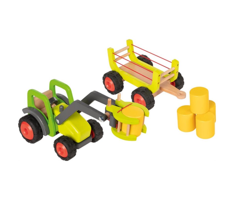 Tracteur avec voiture de foin en bois (55,4x16,3x15,2cm) Goki, 7 pièces, 5 balles de foin, pneus caoutchouc (3+).