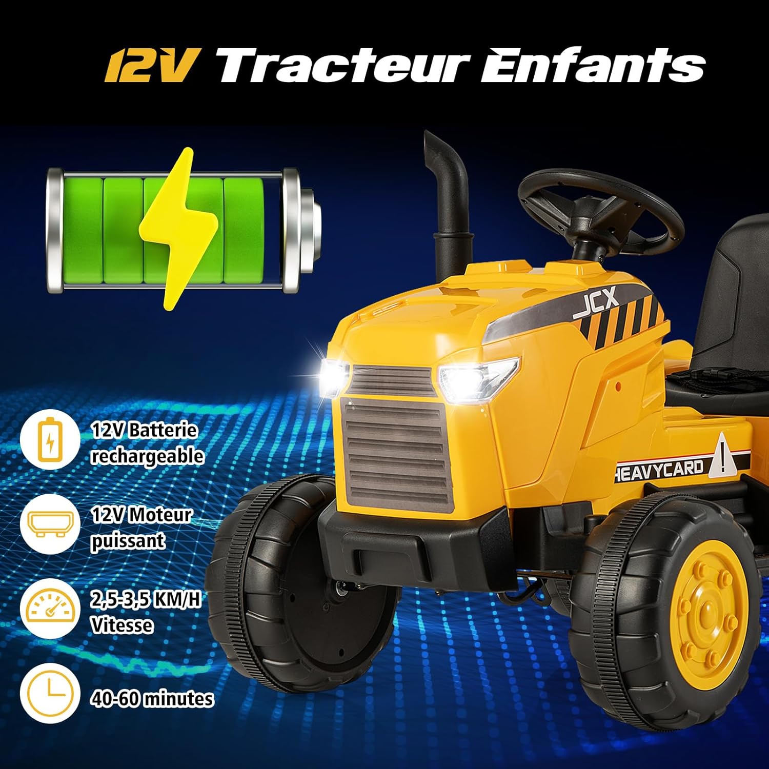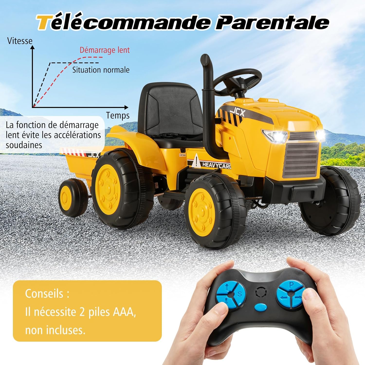 Tracteur electrique enfants 12v avec remorque amovible, 3 vitesses 2,5-3,5 km/h, télécommande,jaune