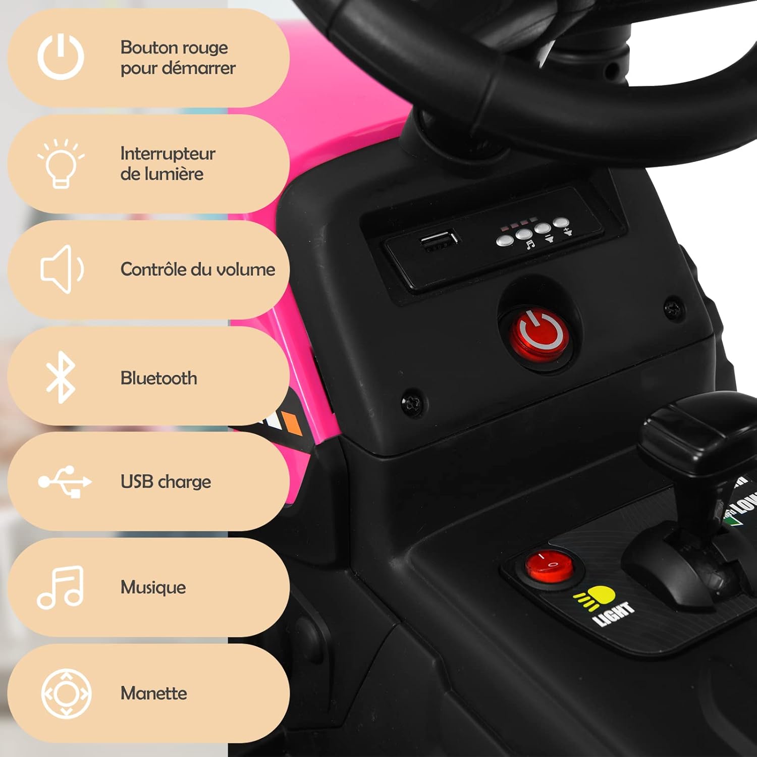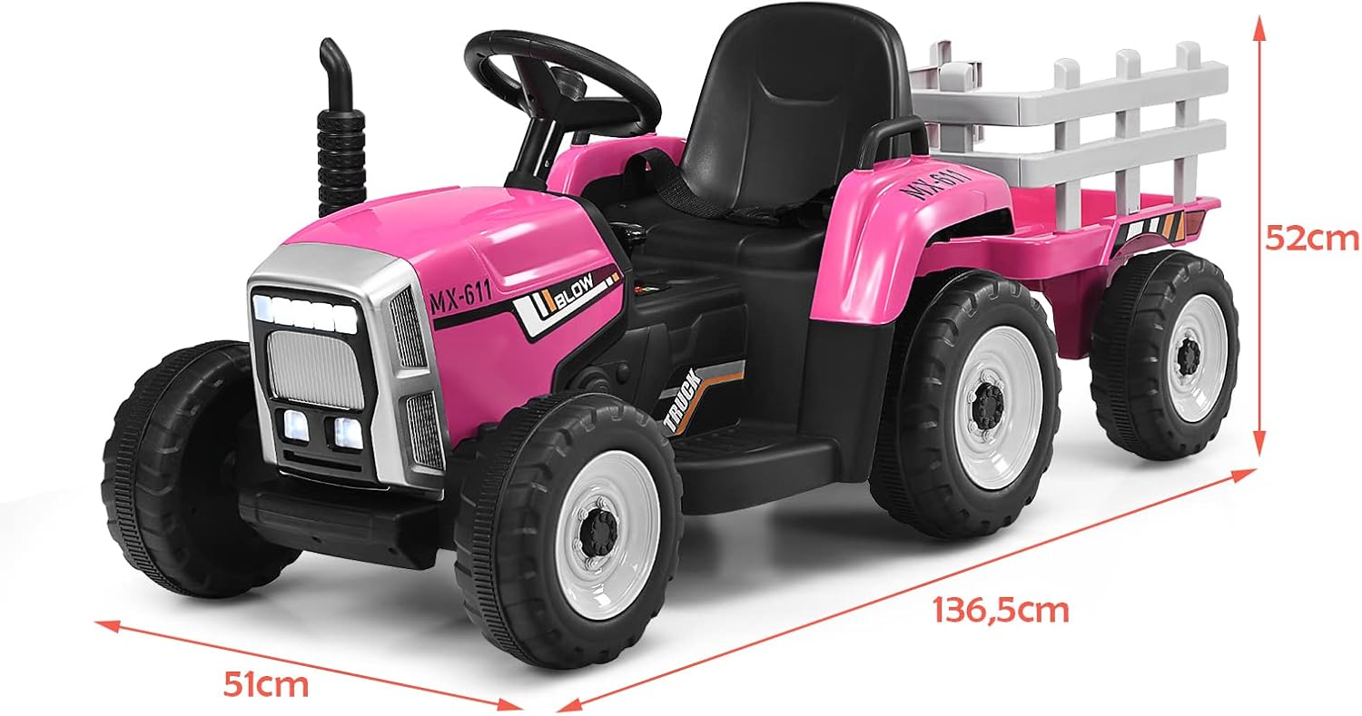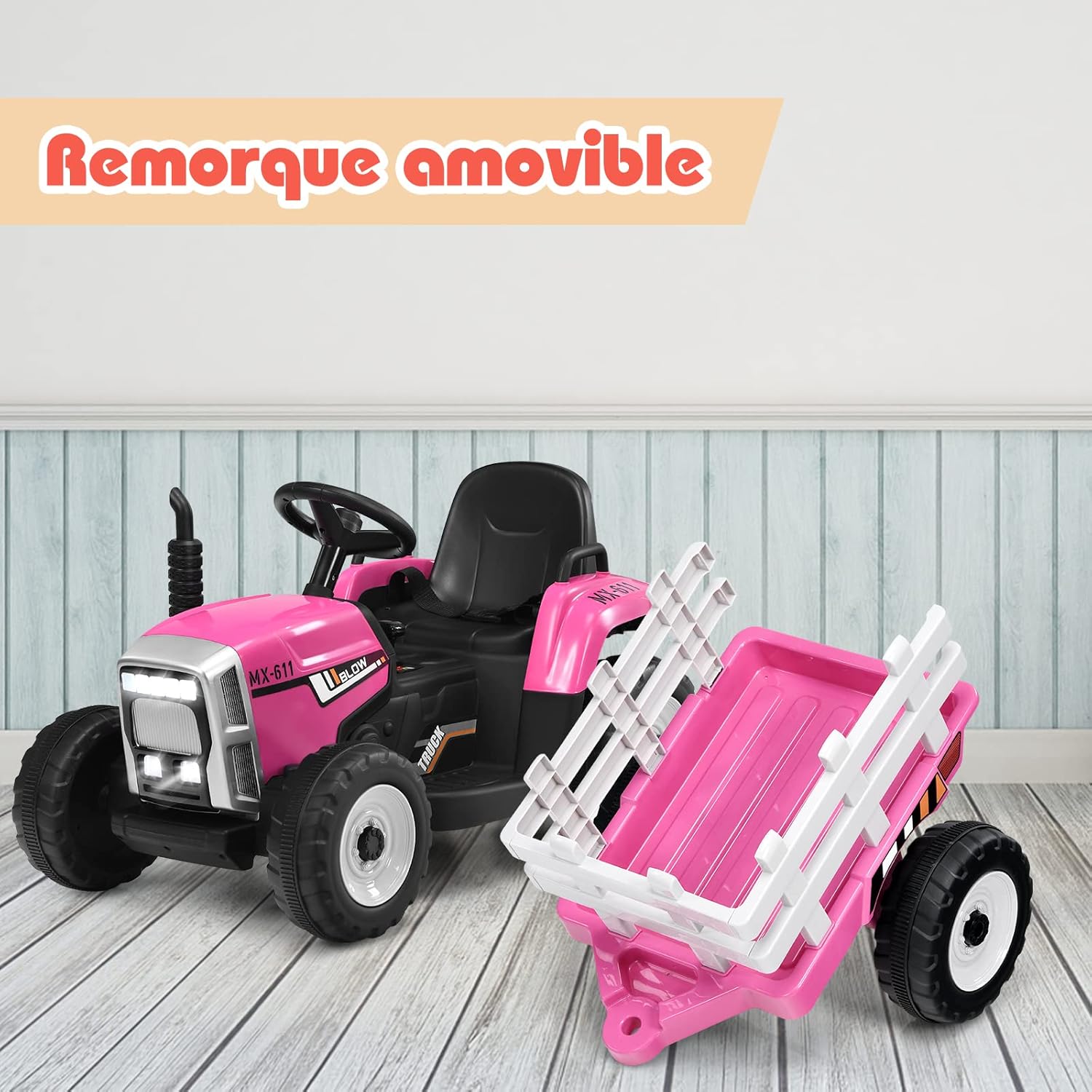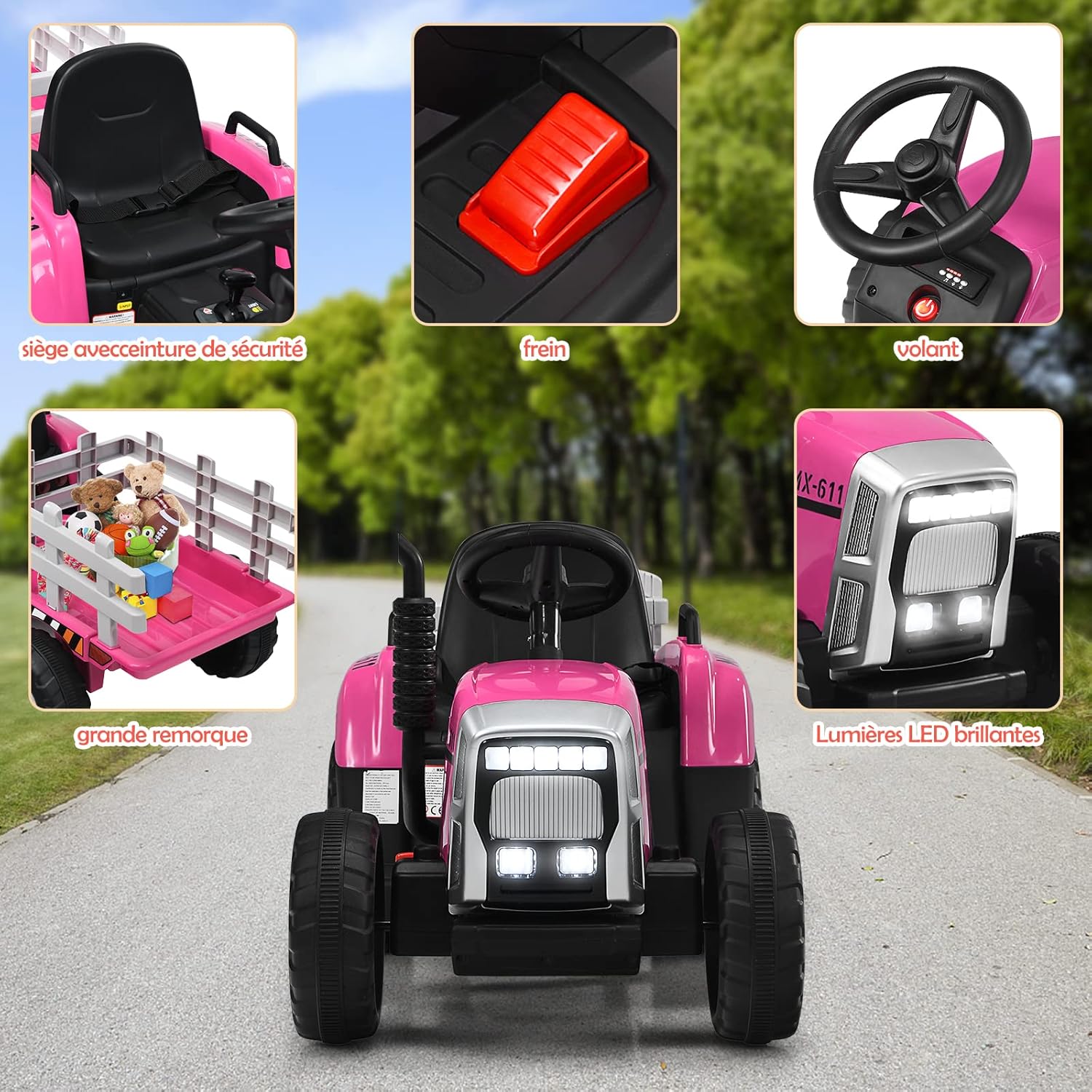 Tracteur electrique enfants 12v remorque, phare led musique, voiture electrique enfants 3 ans+ rose