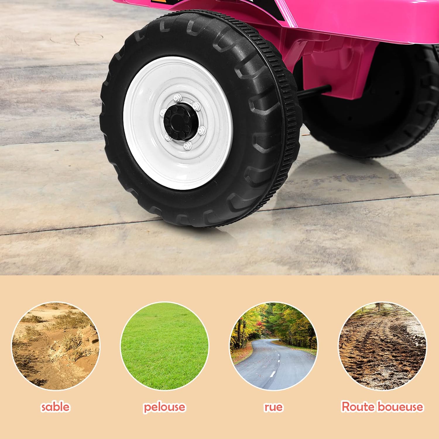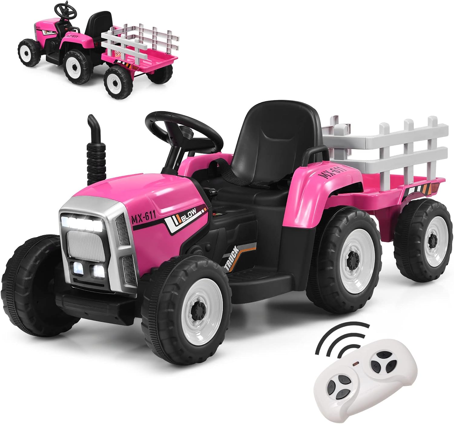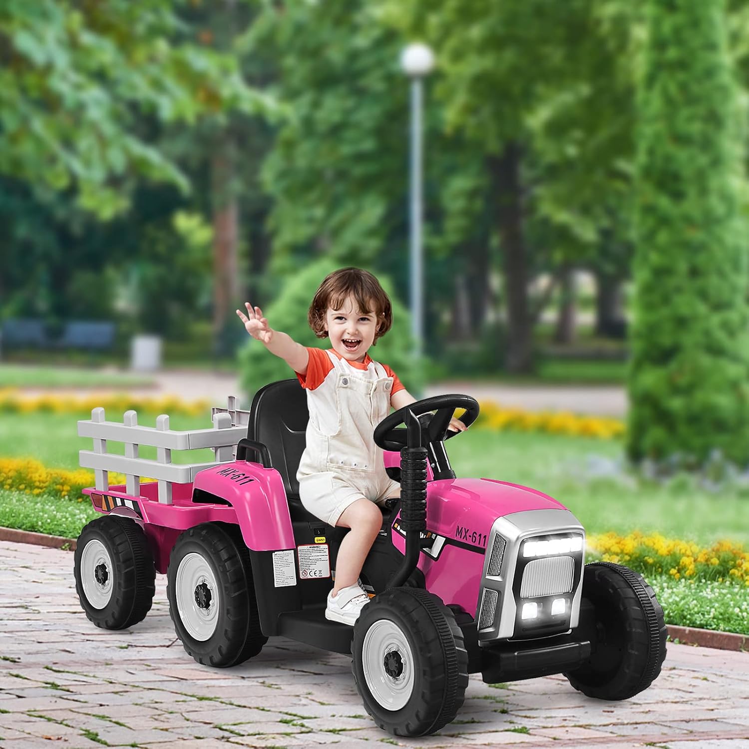Tracteur electrique enfants 12v remorque, phare led musique, voiture electrique enfants 3 ans+ rose