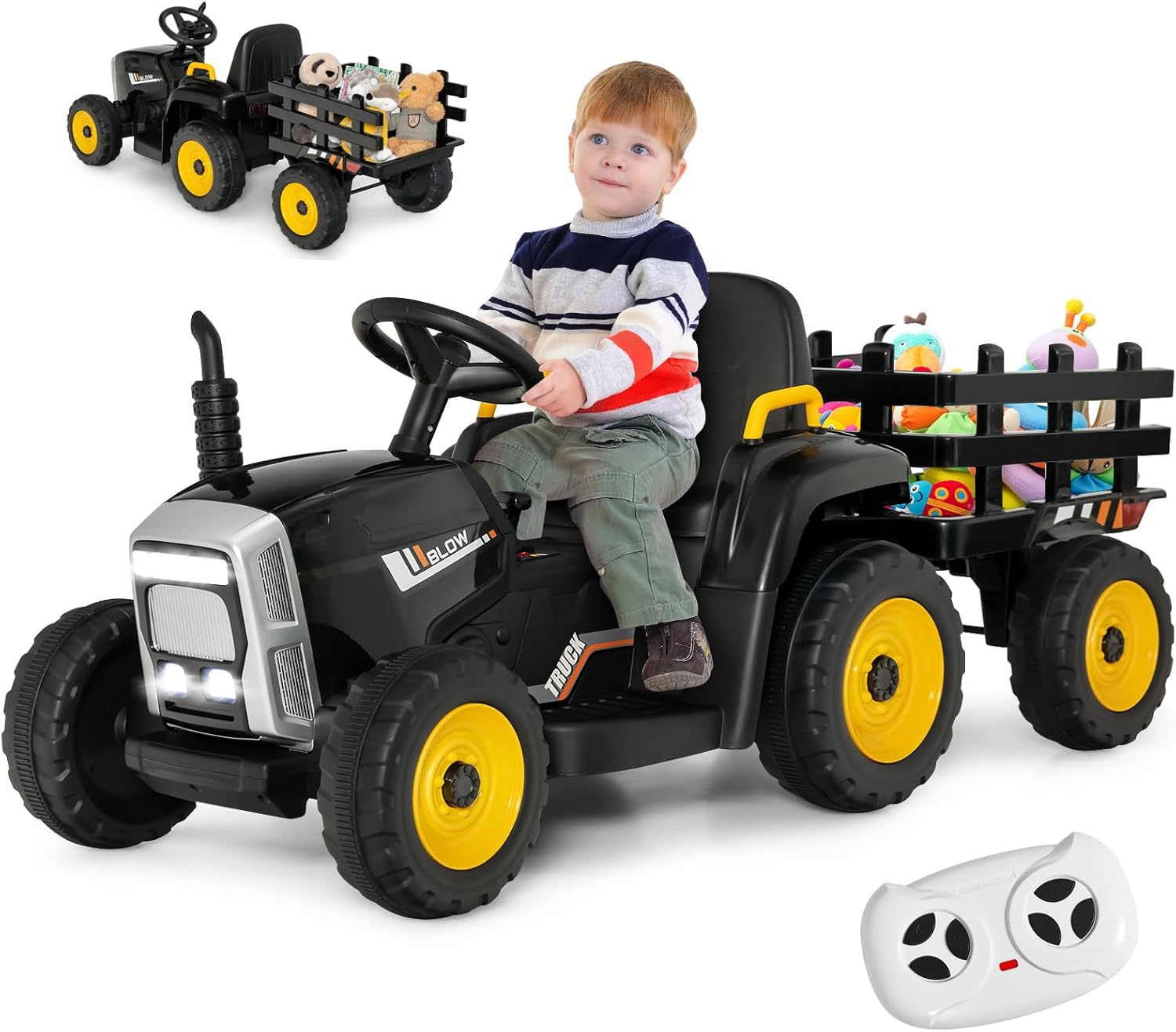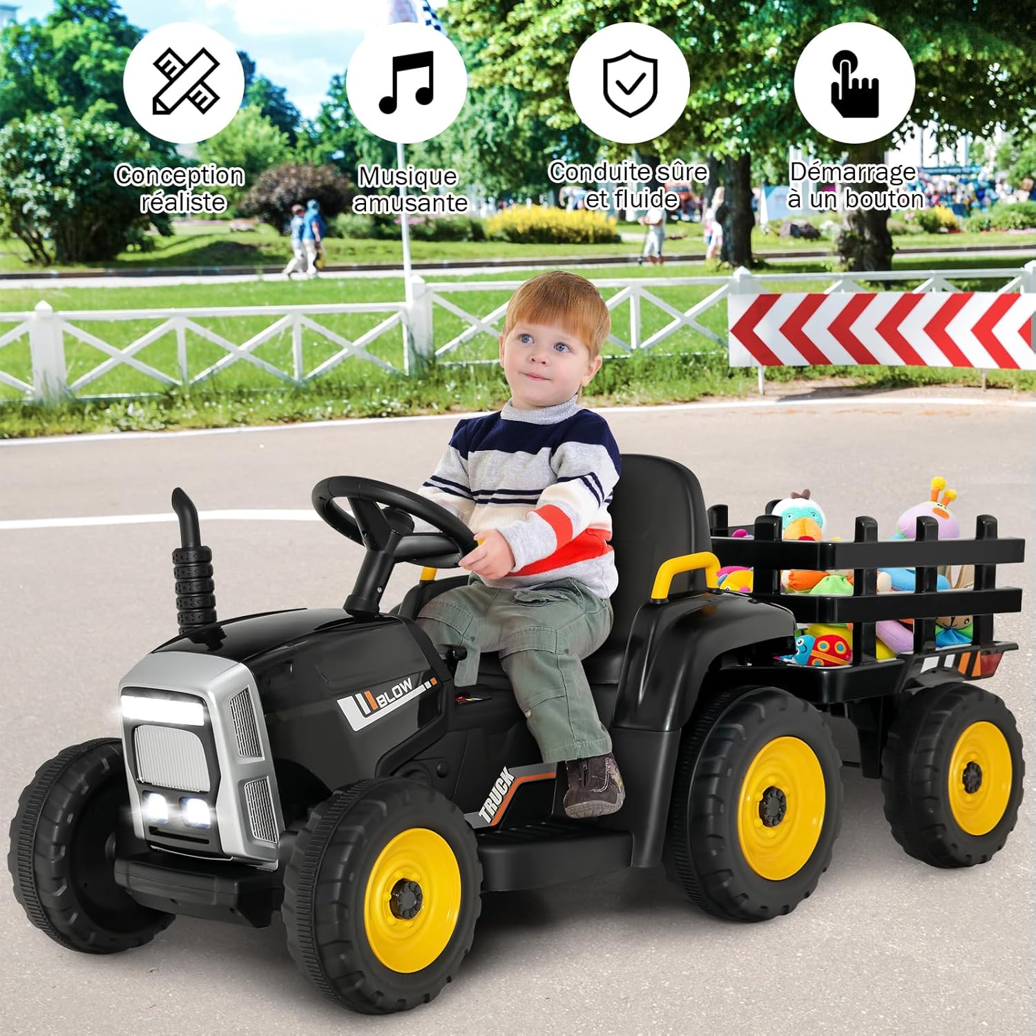 Tracteur electrique enfants avec remorque 12v, phare à led et musique, voiture electrique enfants noir