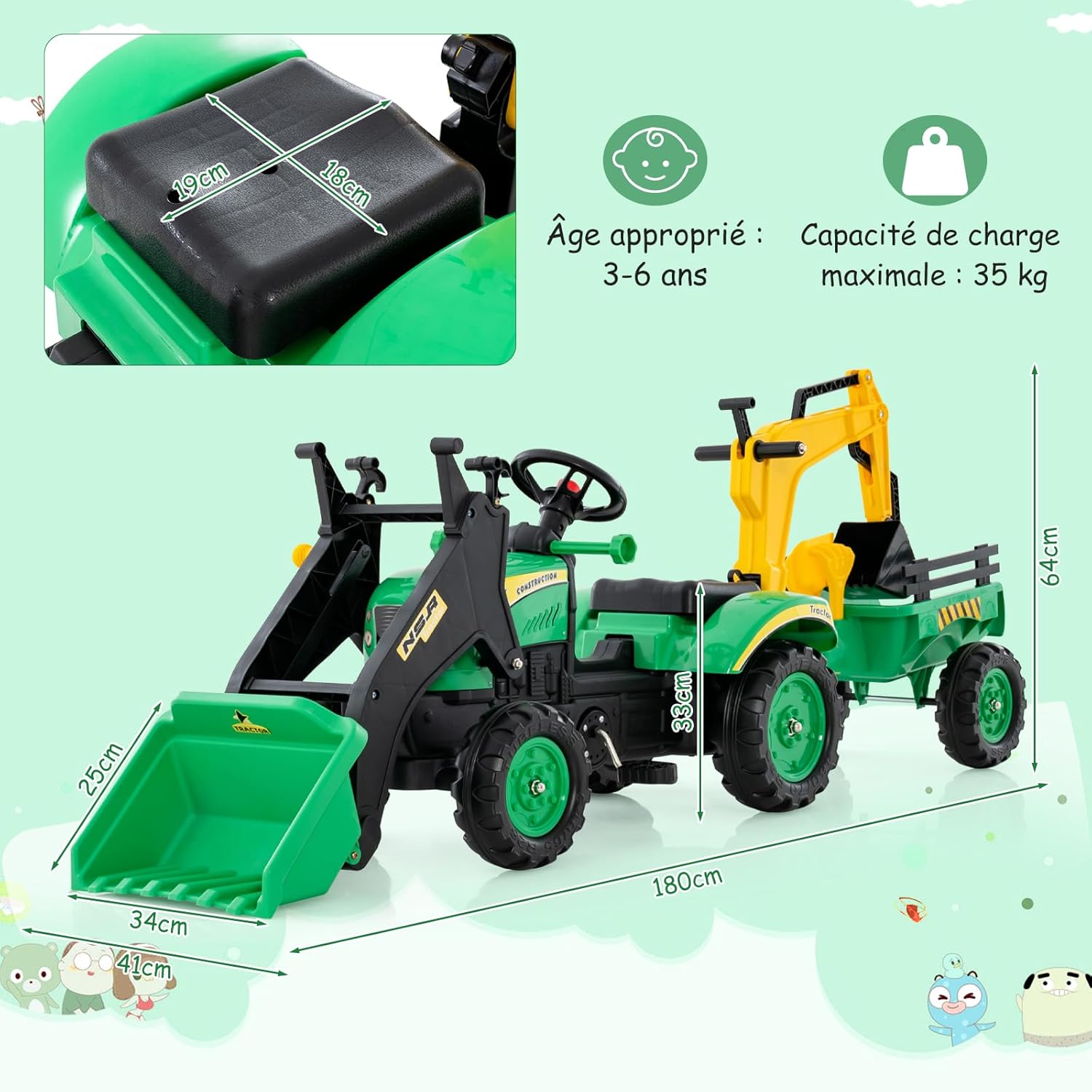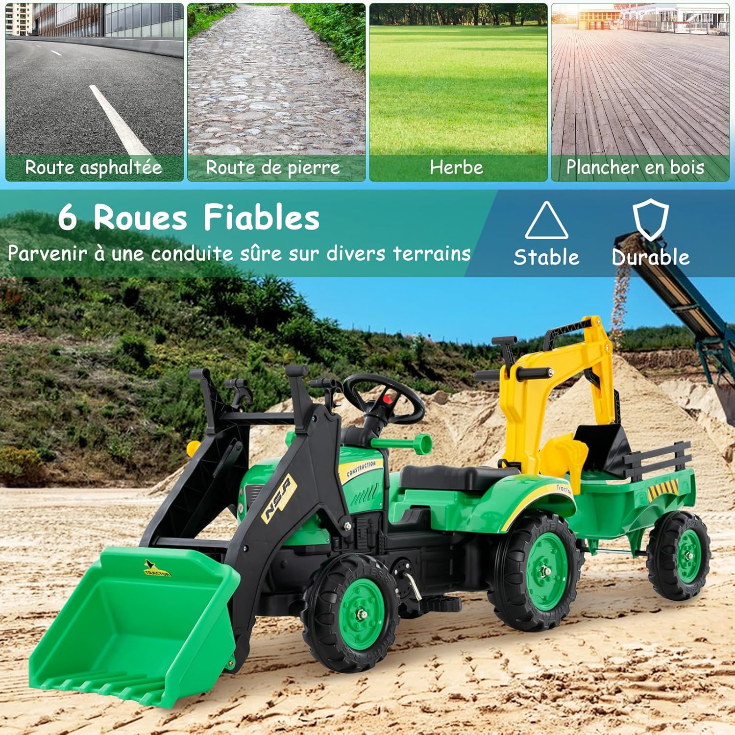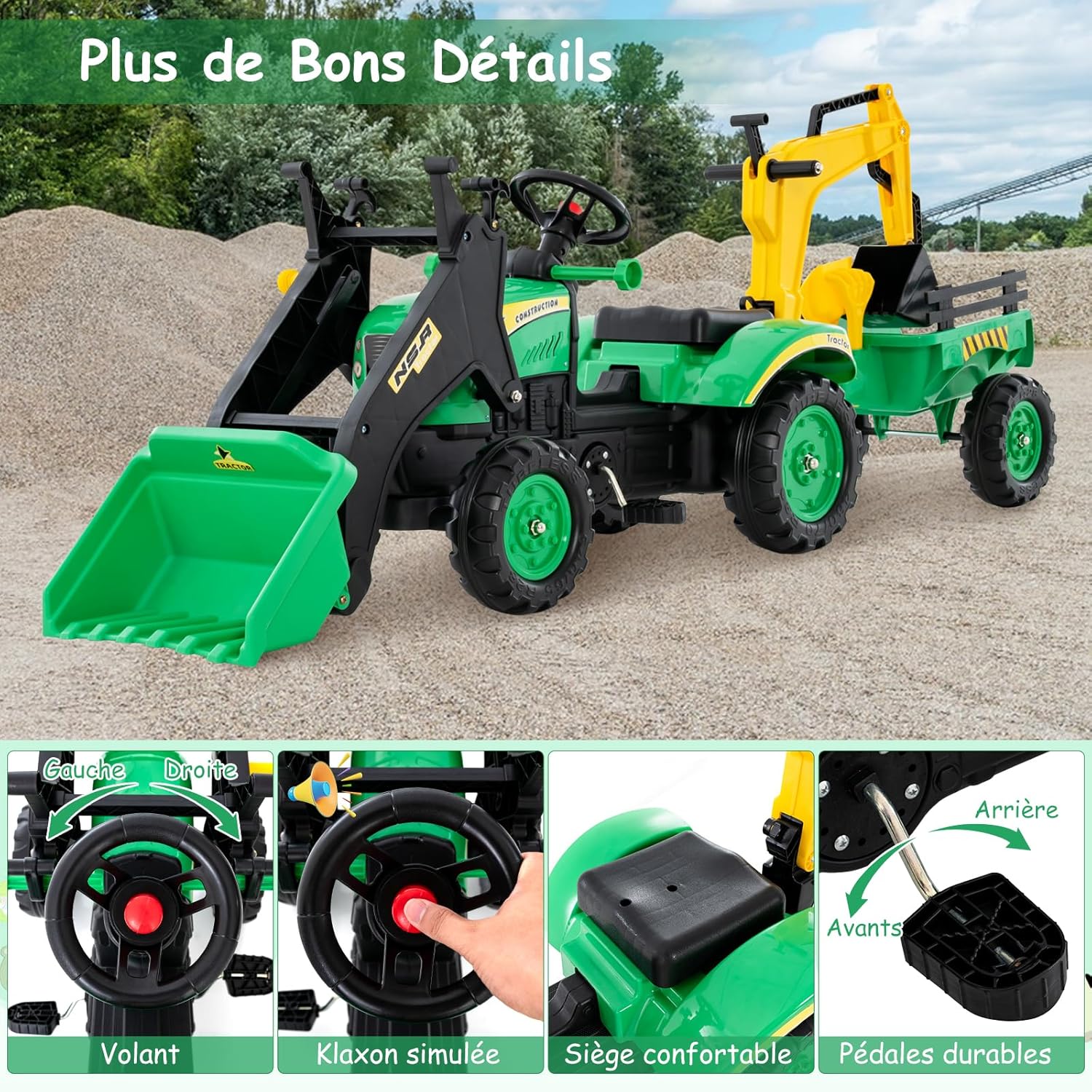 | Libellé | Tracteur enfants, voiture pour enfants avec 6 roues, remorque amovible, bulldozer jouet d'imitation vert |