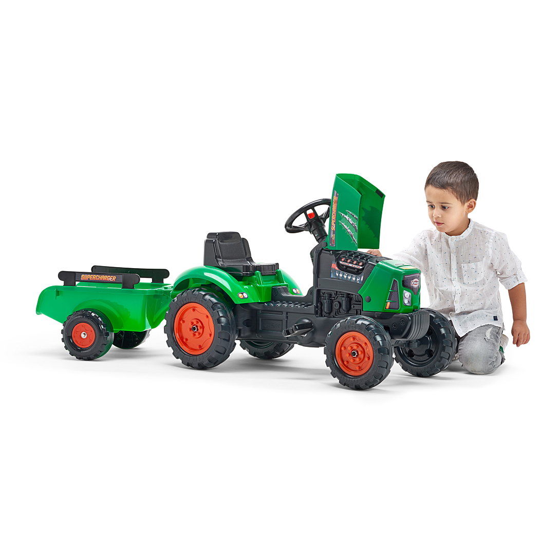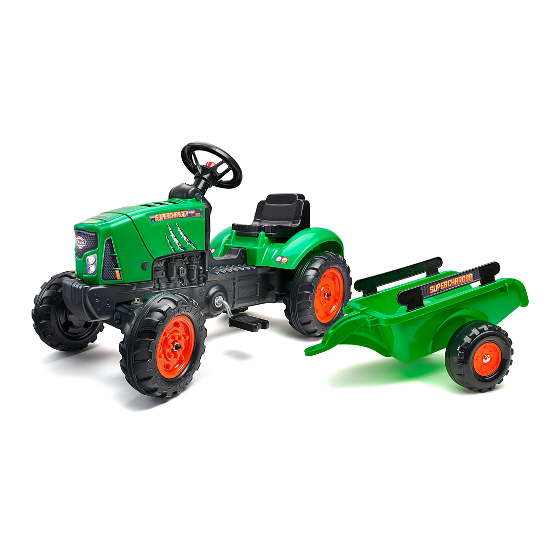 Tracteur Supercharger vert avec volant directionnel avec klaxon et remorque - 100% made in France composé à 50% de plastique recyclé dès 2 ans.