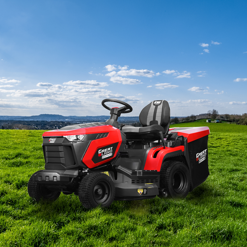 Le tracteur tondeuse Greatland Expert est équipé d'un moteur Loncin de 432cc / 8.8Kw et dispose d'un bac de ramassage arrière de 280L.