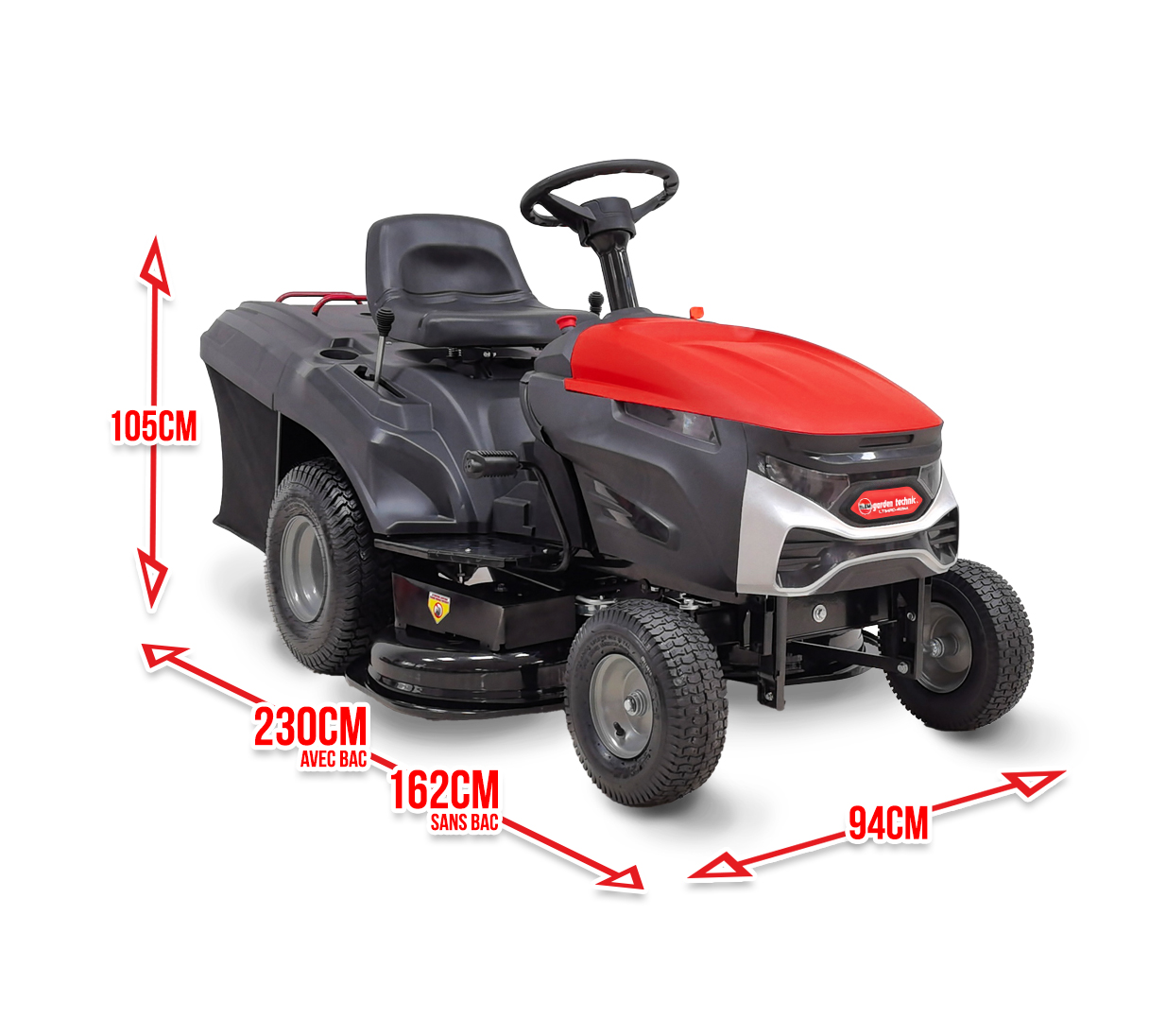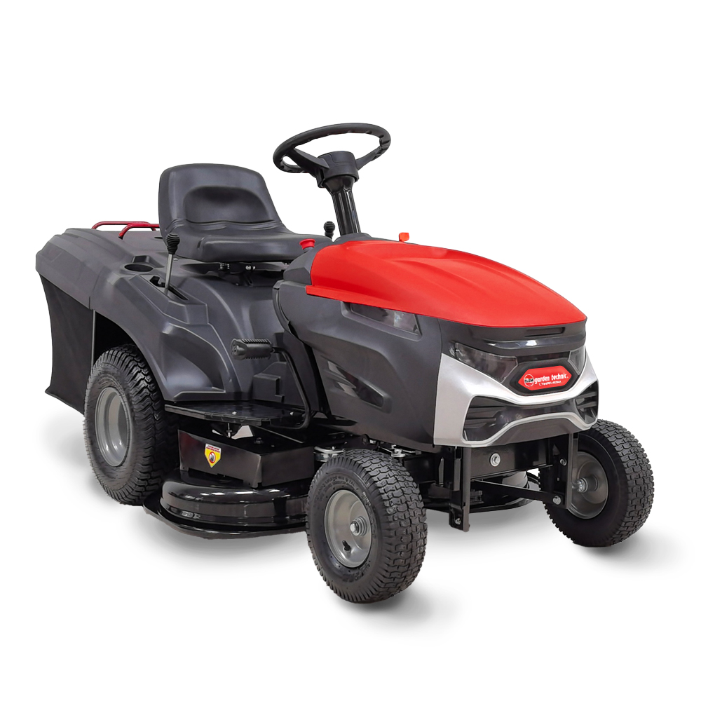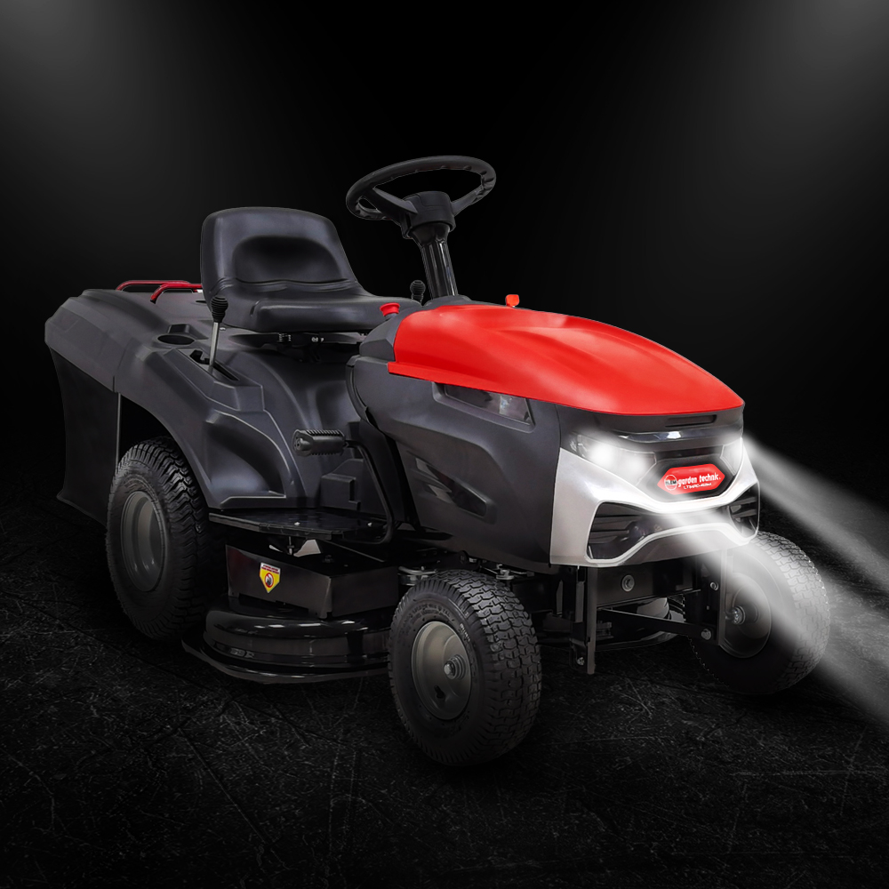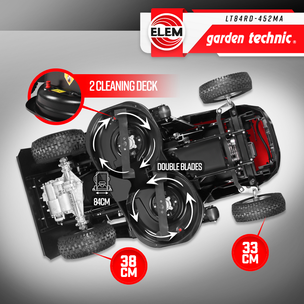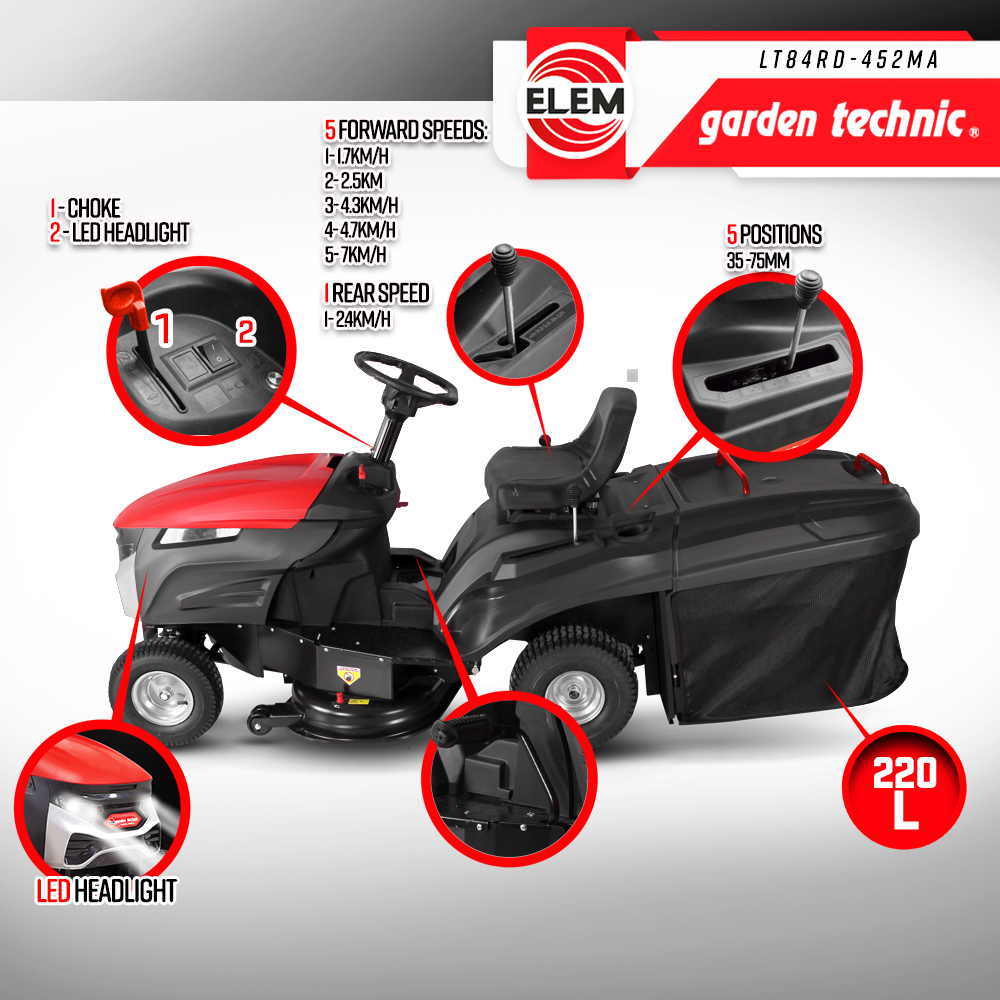 Le tracteur tondeuse Elem Garden est équipé d'un moteur Loncin de 452cc / 8.2Kw à 2900t/min et dispose d'un bac de ramassage arrière de 220L et d'un volant surélevé pour un meilleur confort de conduite.