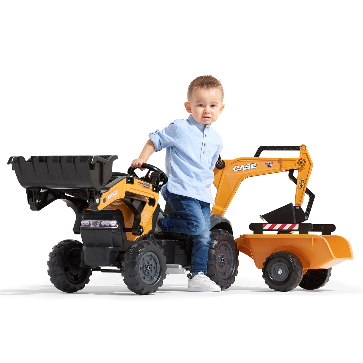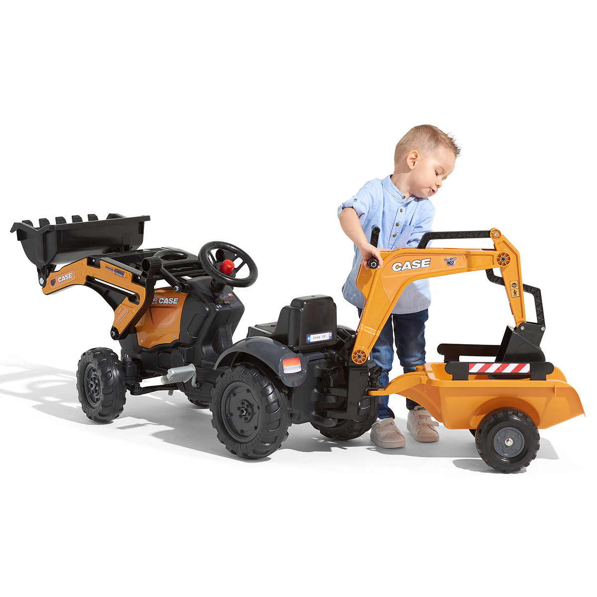 Tractopelle à pédales Falk Case CE avec excavatrice arrière et remorque incluse - Orange