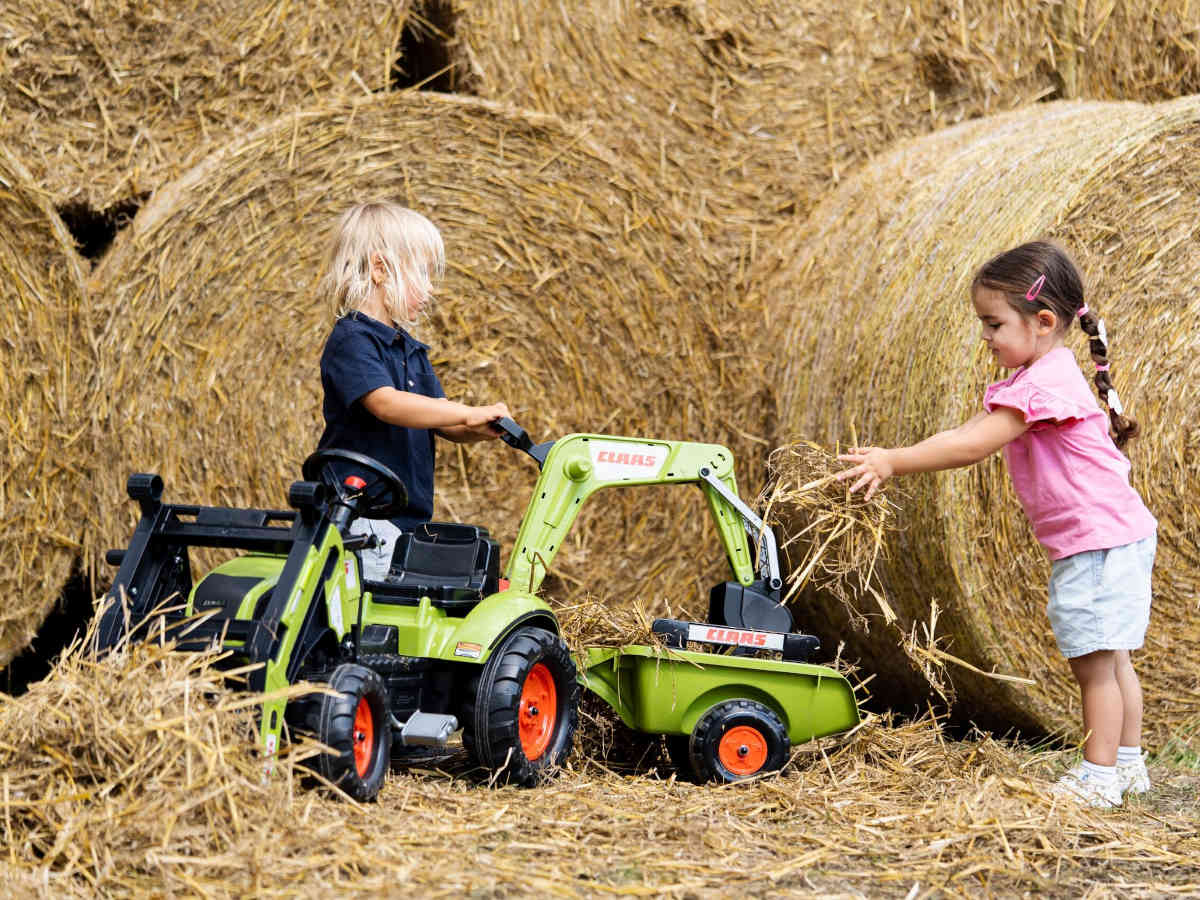 Issu de la gamme "les petits bâtisseurs" by Falk, le tractopelle à pédales Claas avec excavatrice et remorque amovible est un jouet d'extérieur, ludique et 100% de fabrication Française.
