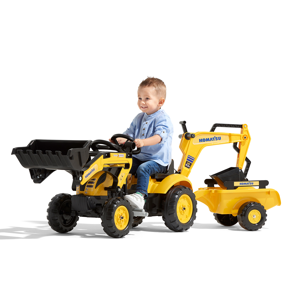 Tractopelle à pédales Falk Komatsu avec excavatrice arrière et remorque incluse - Jaune