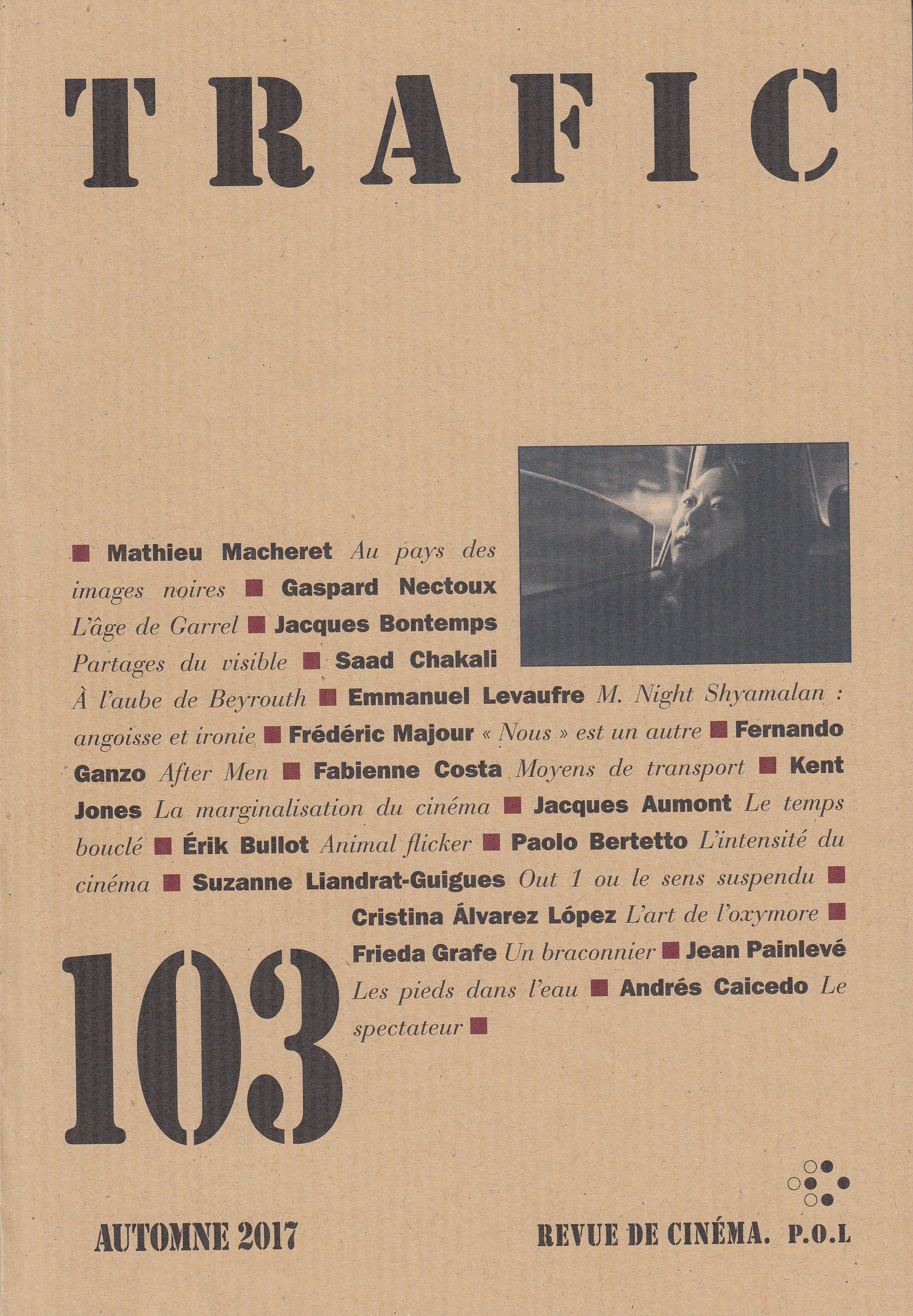 Mathieu Macheret, Au pays des images noires Gaspard Nectoux, L'âge de Garrel. Notes contemporaines à L'Amant d'un jour Jacques Bontemps, Partages du visible. À propos d'À discrétion de Cédric Venail Saad Chakali, À l'aube de Beyrouth. Quelques jours à l'ALBA Emmanuel Levaufre, M. Night Shyamalan : angoisse et ironie Frédéric Majour, "Nous" est un autre. Split de M. Night Shyamalan Fernando Ganzo, After Men. Phénomènes et After Earth de M. Night Shyamalan Fabienne Costa, Moyens de transport. Incassable de M. Night Shyamalan Kent Jones, La marginalisation du cinéma Jacques Aumont, Le temps bouclé Érik Bullot, Animal flicker Paolo Bertetto, L'intensité du cinéma Suzanne Liandrat-Guigues, Out 1 ou Le sens suspendu Cristina Álvarez López, L'art de l'oxymore. Aimer, boire et chanter d'Alain Resnais Frieda Grafe, Un braconnier. Jean Painlevé, 1902-1989 Jean Painlevé, Les pieds dans l'eau Camila Beltrán, "Andrés Caicedo appelait Cali, sa ville natale, "Calicachot..."" Andrés Caicedo, Le spectateur