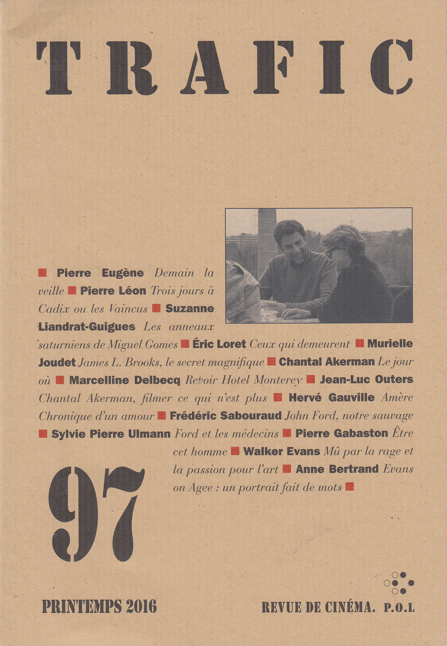Pierre Eugène, Demain la veille Pierre Léon, Trois jours à Cadix ou les Vaincus Suzanne Liandrat-Guigues, Les anneaux saturniens de Miguel Gomes Éric Loret, Ceux qui demeurent. La Vanité de Lionel Baier Murielle Joudet, James L. Brooks, le secret magnifique Chantal Akerman, Le jour où Marcelline Delbecq, Revoir Hotel Monterey Jean-Luc Outers, Chantal Akerman, filmer ce qui n'est plus Hervé Gauville, Amère Chronique d'un amour Frédéric Sabouraud, John Ford, notre sauvage Sylvie Pierre Ulmann, Ford et les médecins Pierre Gabaston, Être cet homme. Nanouk l'Esquimau de Robert Flaherty Walker Evans, Mû par la rage et la passion pour l'art Anne Bertrand, Evans on Agee : un portrait fait de mots