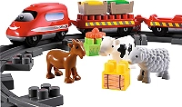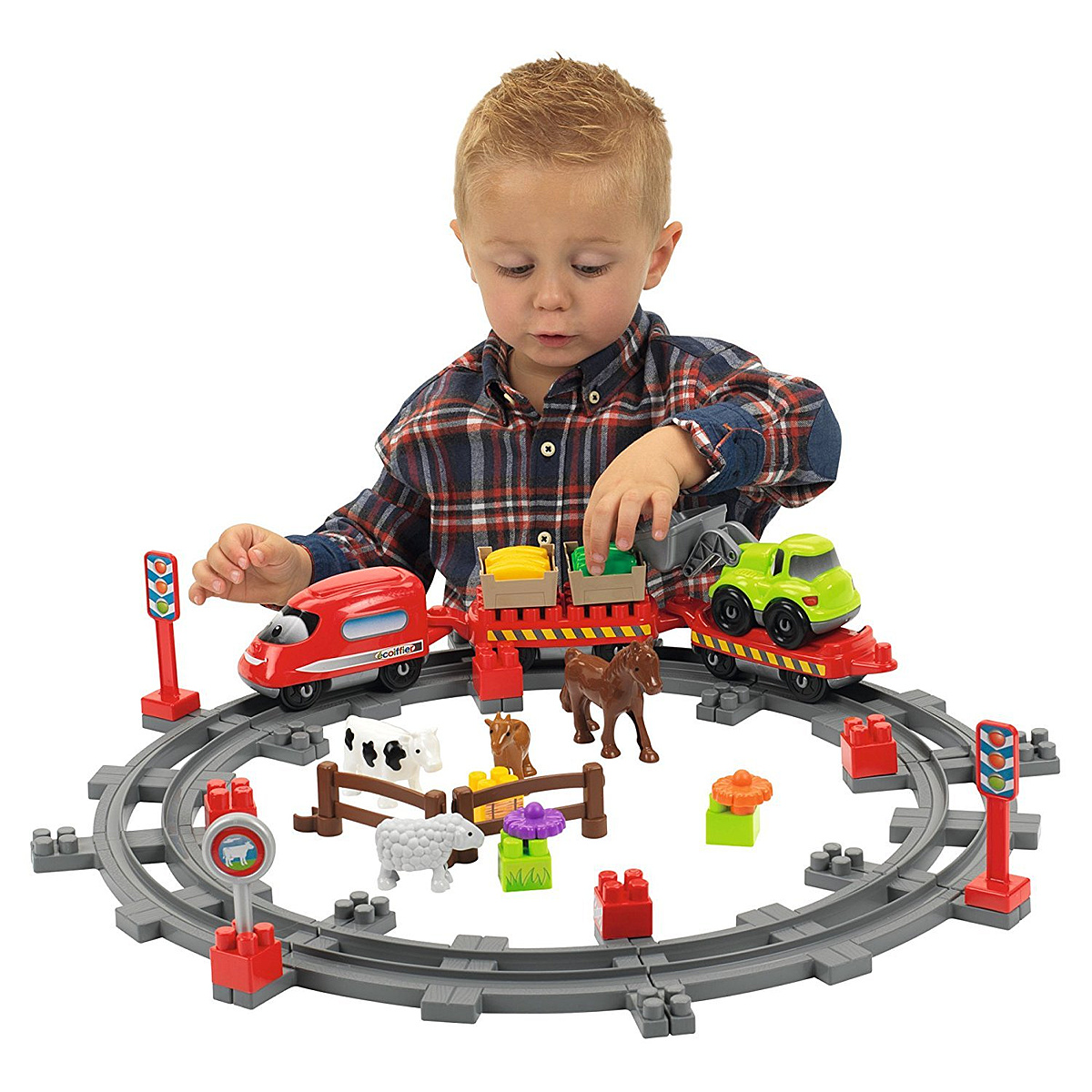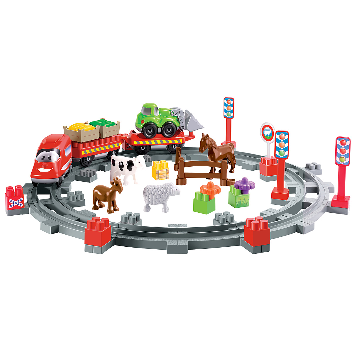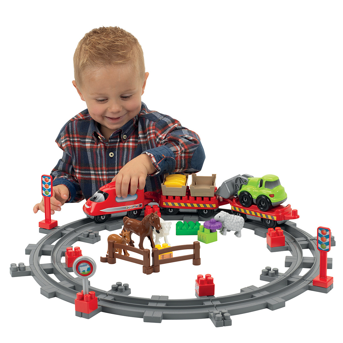 Un circuit de train dont les rails se fixent avec des briques sur lequel circule un train tirant 2 wagons pour ravitailler les 4 animaux. dès 18 mois. fabrication française.