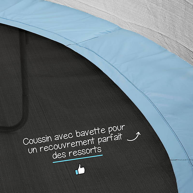 TRAMPOLINE DE JARDIN FUNNI BLUE 360 + filet de sécurité Fruit de l’expérience et du savoir-faire de la 1ère marque française de trampoline: KANGUI, le FUNNI BLUE 360 a été conçu pour que vous puissiez faire le bonheur de votre famille. Un trampoline familial pour usage extérieur : • Il est lourd et robuste. L’armature en acier galvanisé du trampoline est en 1,4 mm d’épaisseur (jambes et pieds inclus) -Si depuis plus de 16 ans, Kangui refuse de fabriquer la partie qui vous porte en 1.2 mm, ce n’est pas pour rien- les emboitements des tubes sont bien longs pour plus de solidité. • Il est durable car toute la structure est en acier galvanisé à chaud (inoxydable) intérieur- extérieur et « non jetable » parce que KANGUI assure un suivi dans le temps. Nos 1ers clients de 1999 trouvent toujours des pièces de rechange ! • Les poteaux du filet sont habillés de chaussettes PVC pour éviter l'effritement des mousses au soleil • Il est souple et agréable grâce aux 72 ressorts coniques de 140mm en acier galvanisé et au tapis de saut de conception américaine (Permatron). Pour une résistance maximale et durable, ce tapis est bordé d’une sangle de renfort et renforcé par 8 rangs de couture. • Il est sécurisant avec 2 atouts majeurs : un coussin déhoussable large (34cm) et épais (22mm) dont la bavette intérieure limite l’accès aux ressorts / Filet de protection ultra résistant parfaitement maintenu par des capuchons innovants (fini les risques de déchirures et le filet qui descend). • Il est facile à monter (QRcode vidéo sur notice)