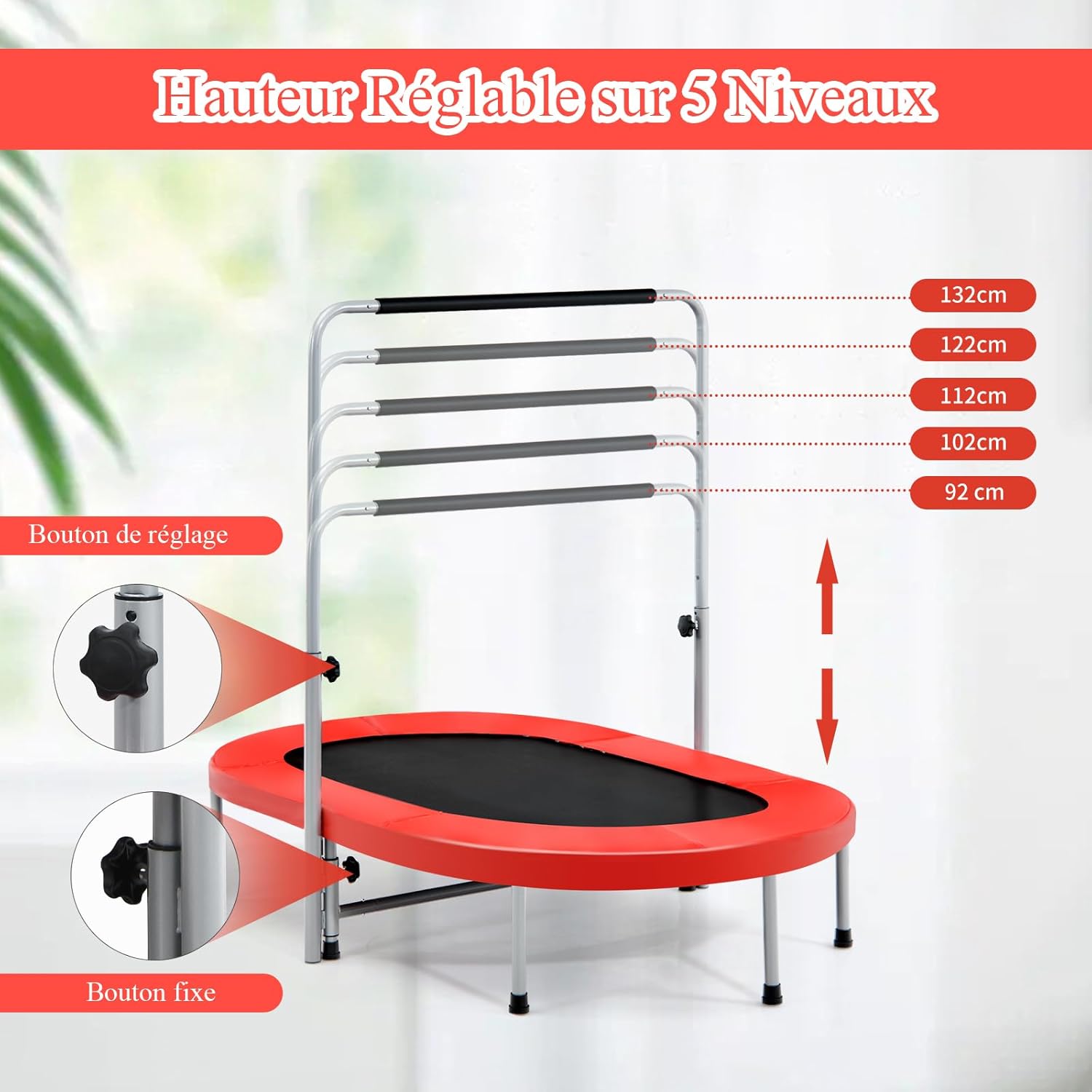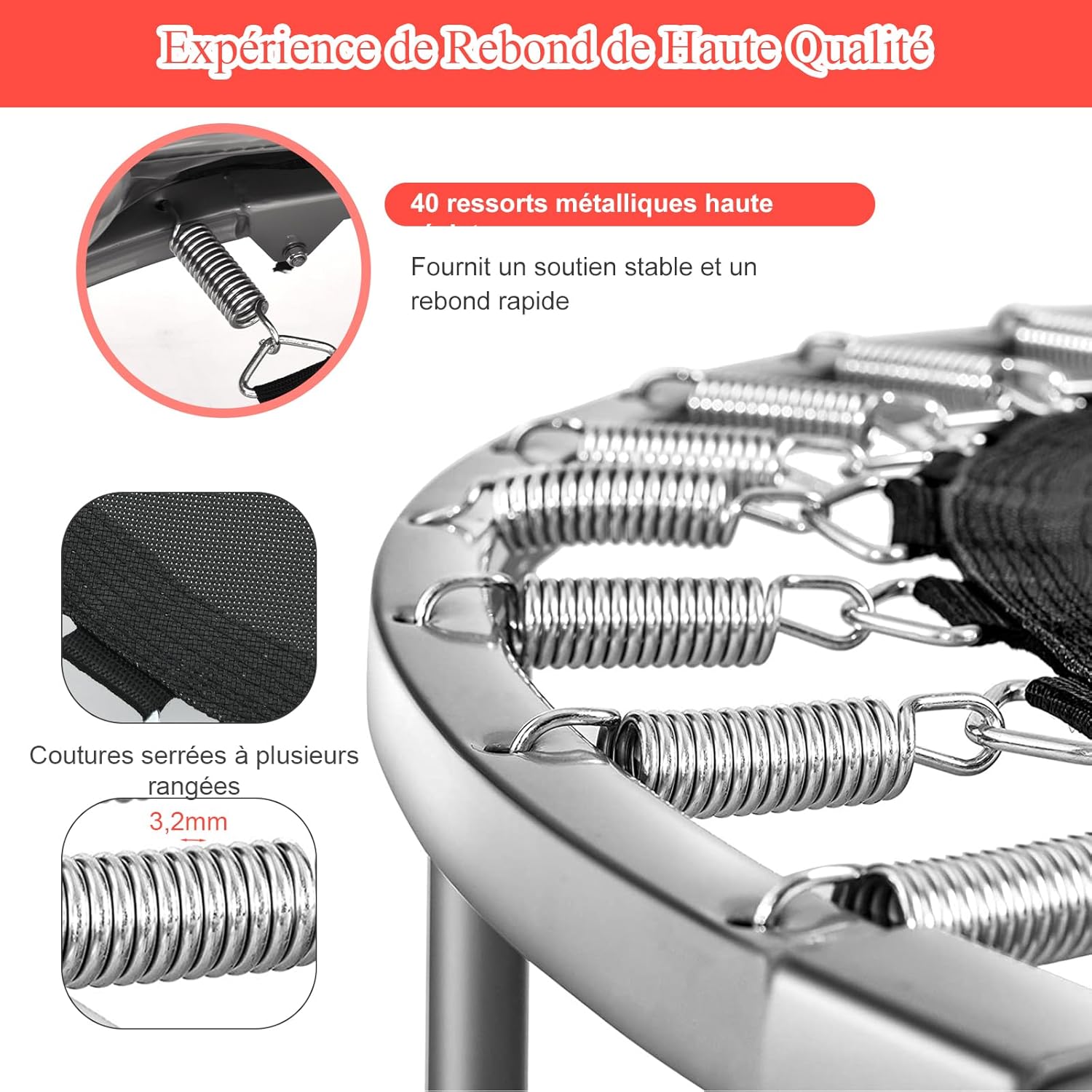 - ﹟Profitez d'une vie saine﹟Ce trampoline peut aider à améliorer la qualité physique de votre famille. Il peut non seulement stimuler la circulation sanguine des personnes âgées, mais aussi aider à perdre du poids et à brûler les calories. Pour vos enfants, il peut contribuer à promouvoir la croissance du squelette et l'amélioration de l'équilibre et les aider à grandir sainement et solidement.