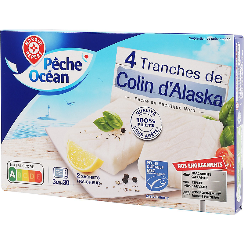 TRANCHES DE FILETS DE COLIN D’ALASKA* (THERAGRA CHALCOGRAMMA) PÊCHÉ AUX CHALUTS EN OCÉAN PACIFIQUE**, CONGELÉES *Qualité sans arête : bien qu’un soin tout particulier ait été pris pour éliminer toutes les arêtes, quelques-unes peuvent exceptionnellement se retrouver dans ce produit. **La lettre indiquée avec la date de durabilité minimale et le numéro de lot correspond à la zone de pêche du colin d'Alaska : pêché en Pacifique Nord-Ouest (A) ou pêché en Pacifique Nord-Est (B). PECHE OCEAN