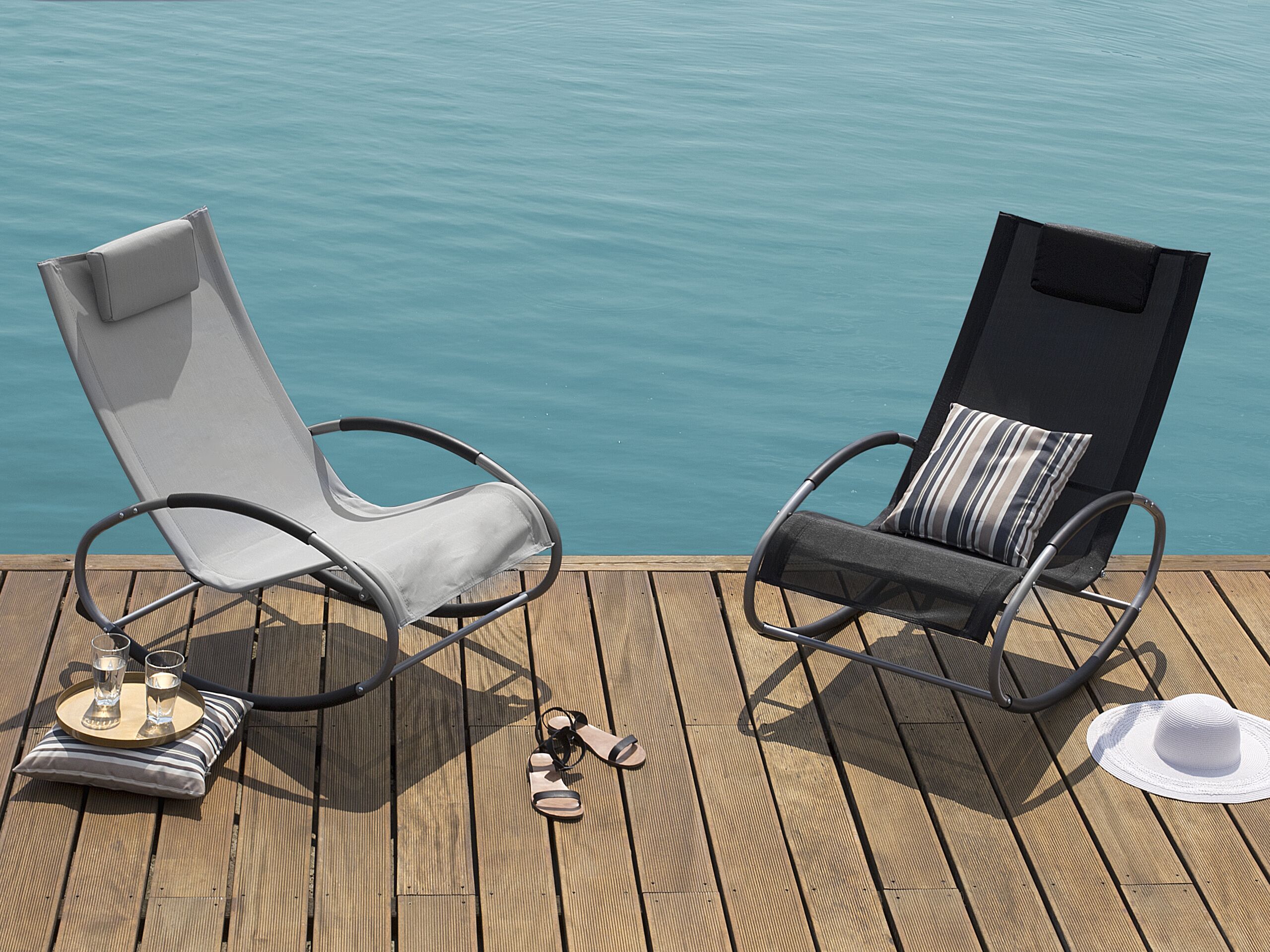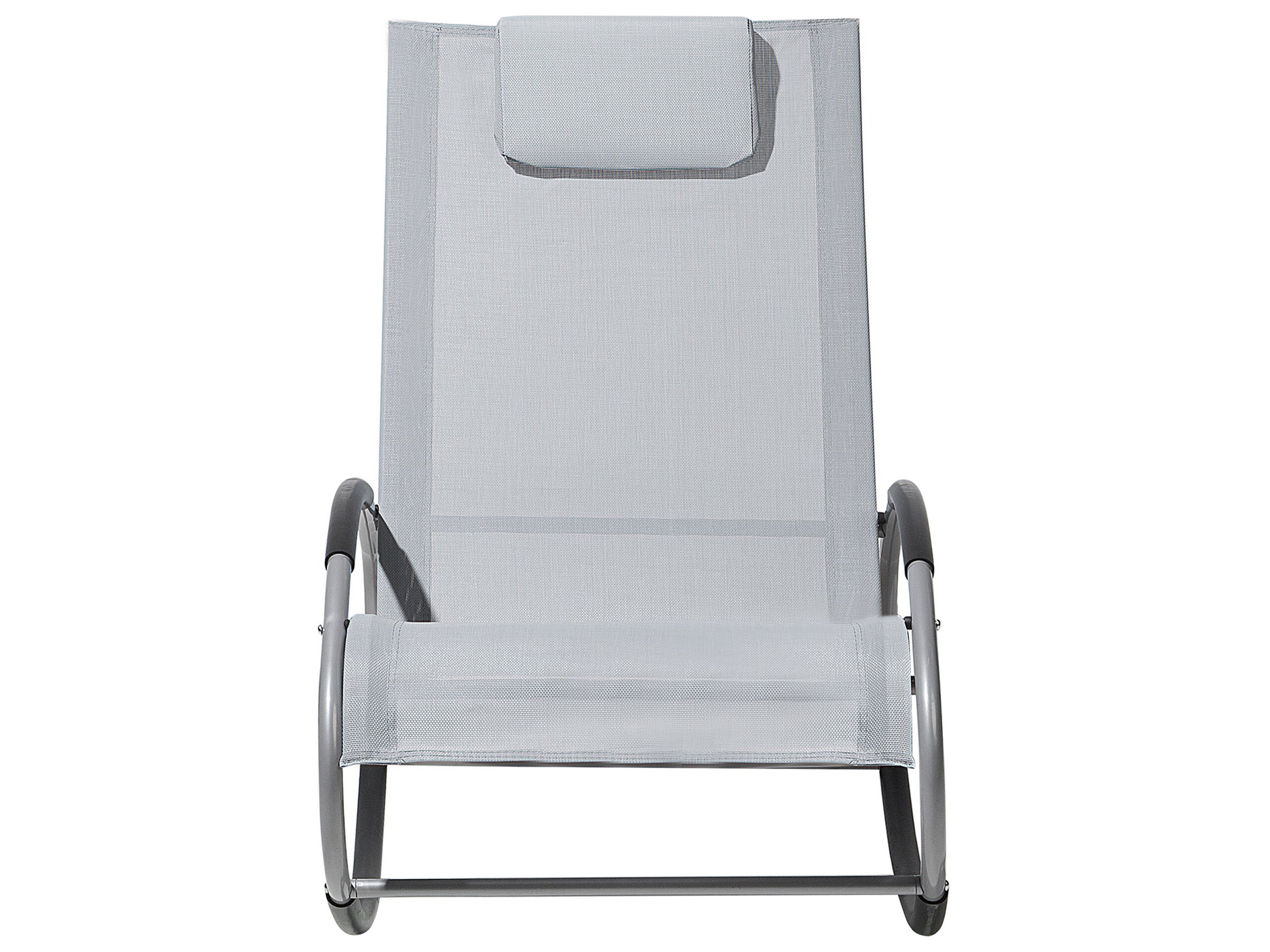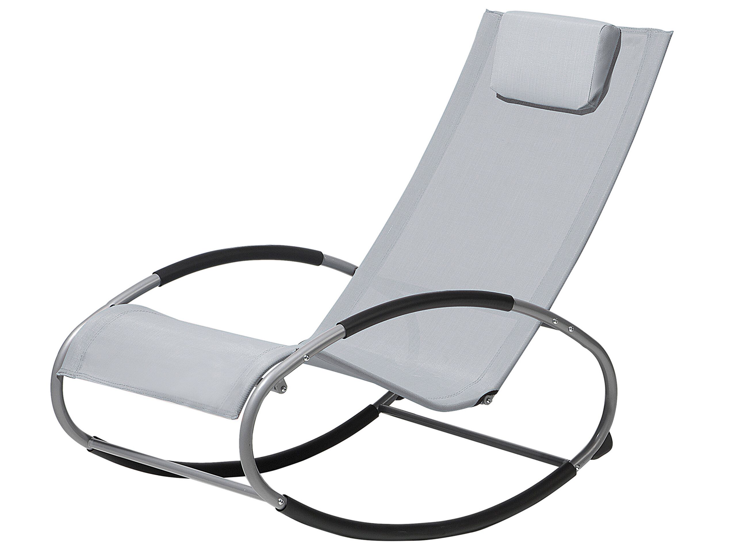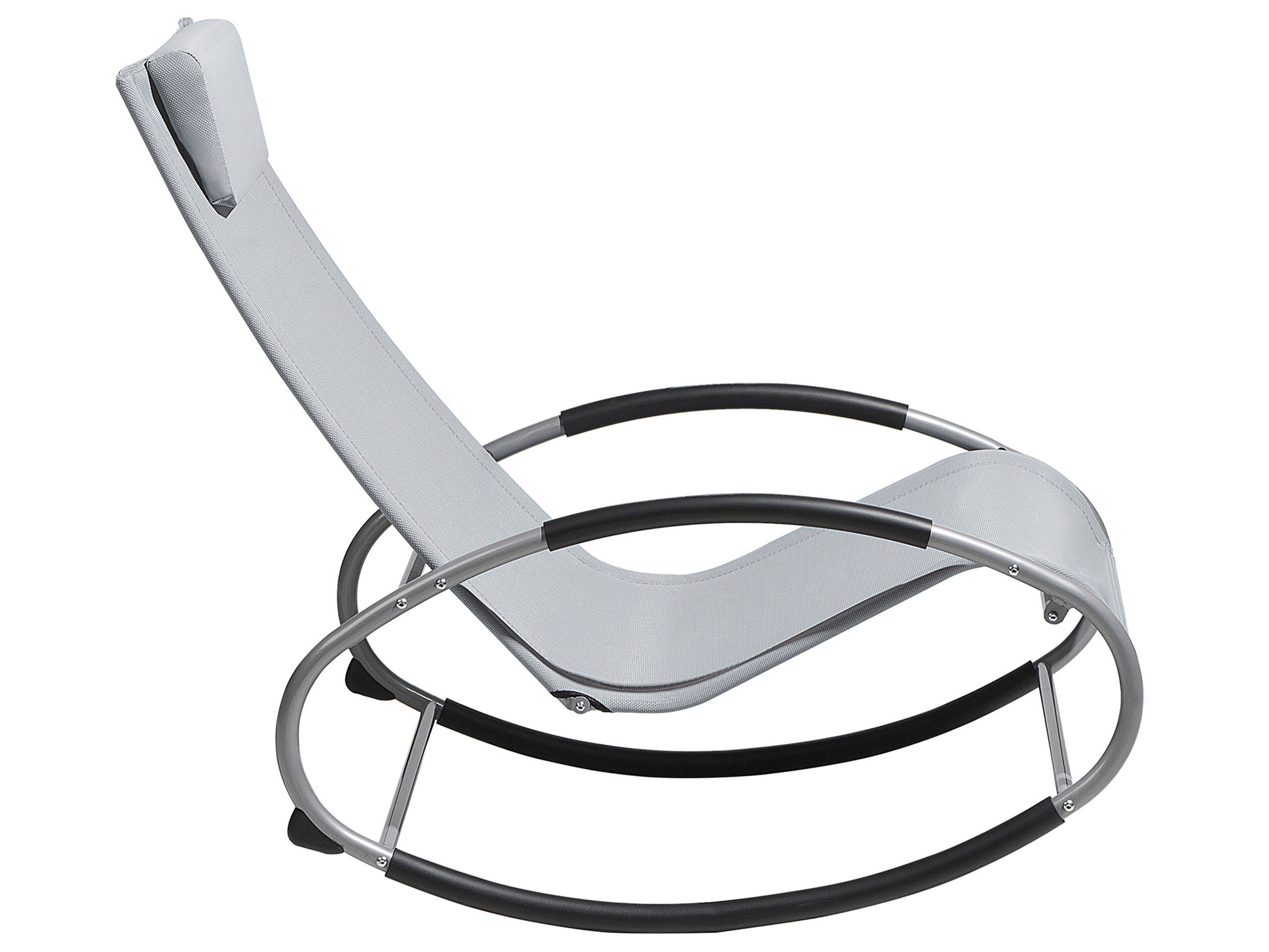 Bain de soleil. Cette chaise longue grise au style contemporain est complétée par son design ergonomique. Les cerceaux en acier revêtu de poudre ajoutent une sensation dynamique au meuble et permettent un léger balancement. Avec des revêtements antidérapants pour la base, les accoudoirs et un repose-tête amovible, la chaise offre un confort ultime. Laissez le stress quotidien derrière vous et profitez de cette chaise longue à bascule !