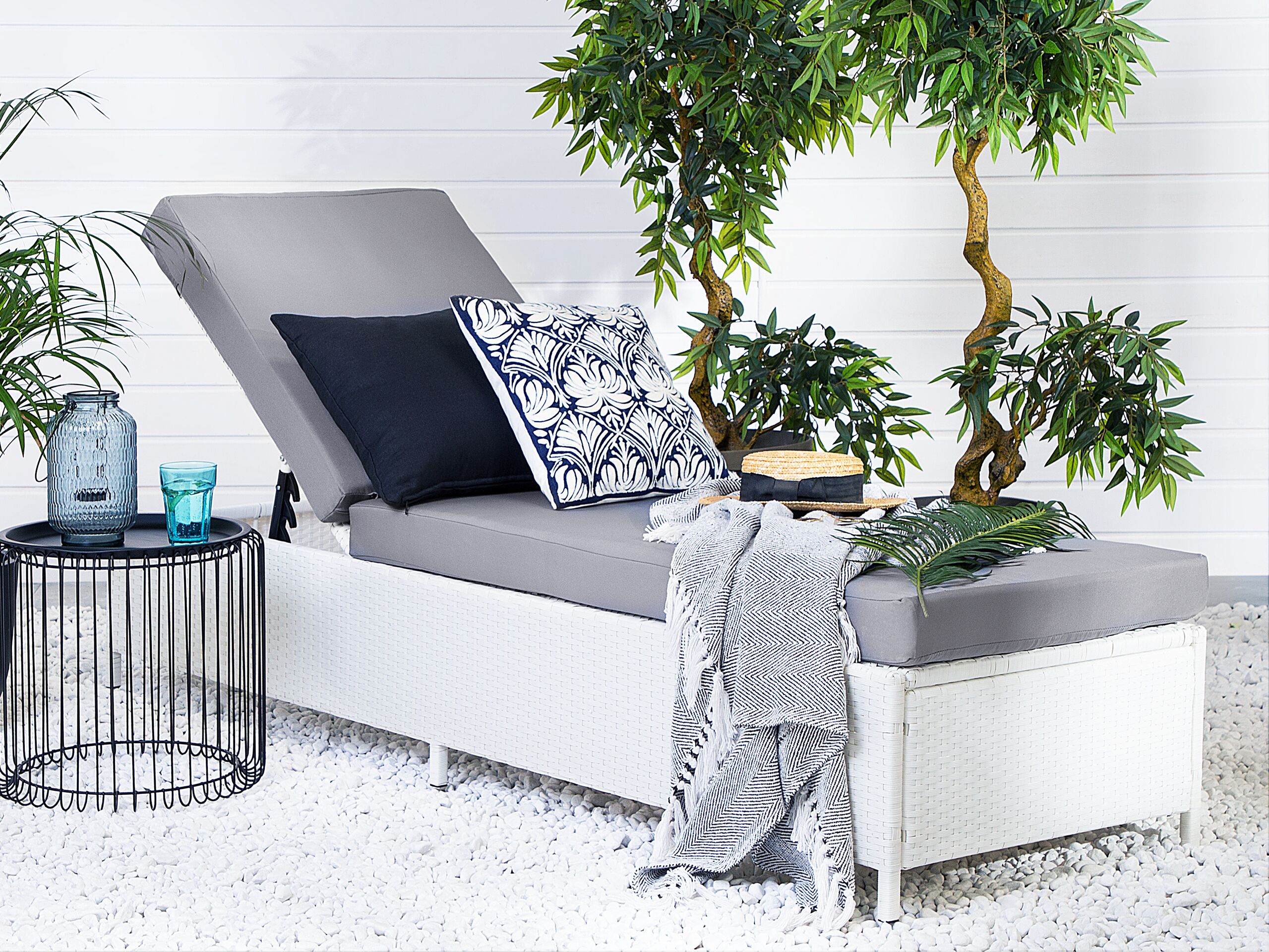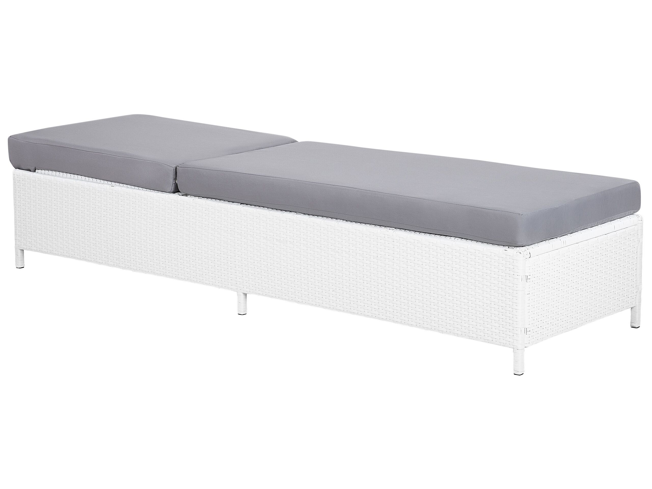 Transat en polyrotin. Cette chaise est fabriquée en polyrotin de haute qualité et écoresponsable. Le cadre est constitué d'un acier poudré exceptionnellement robuste pour une sécurité totale. Le bain de soleil est livré avec un épais coussin gris clair, résistant à l'humidité et aux taches, facile à entretenir et conçu pour s'adapter parfaitement. De plus, la housse du coussin est amovible et peut être lavée en machine. Le dossier réglable permet de choisir entre 5 positions différentes. Lisez un livre, faites une sieste et profitez de l'extérieur en tout confort.