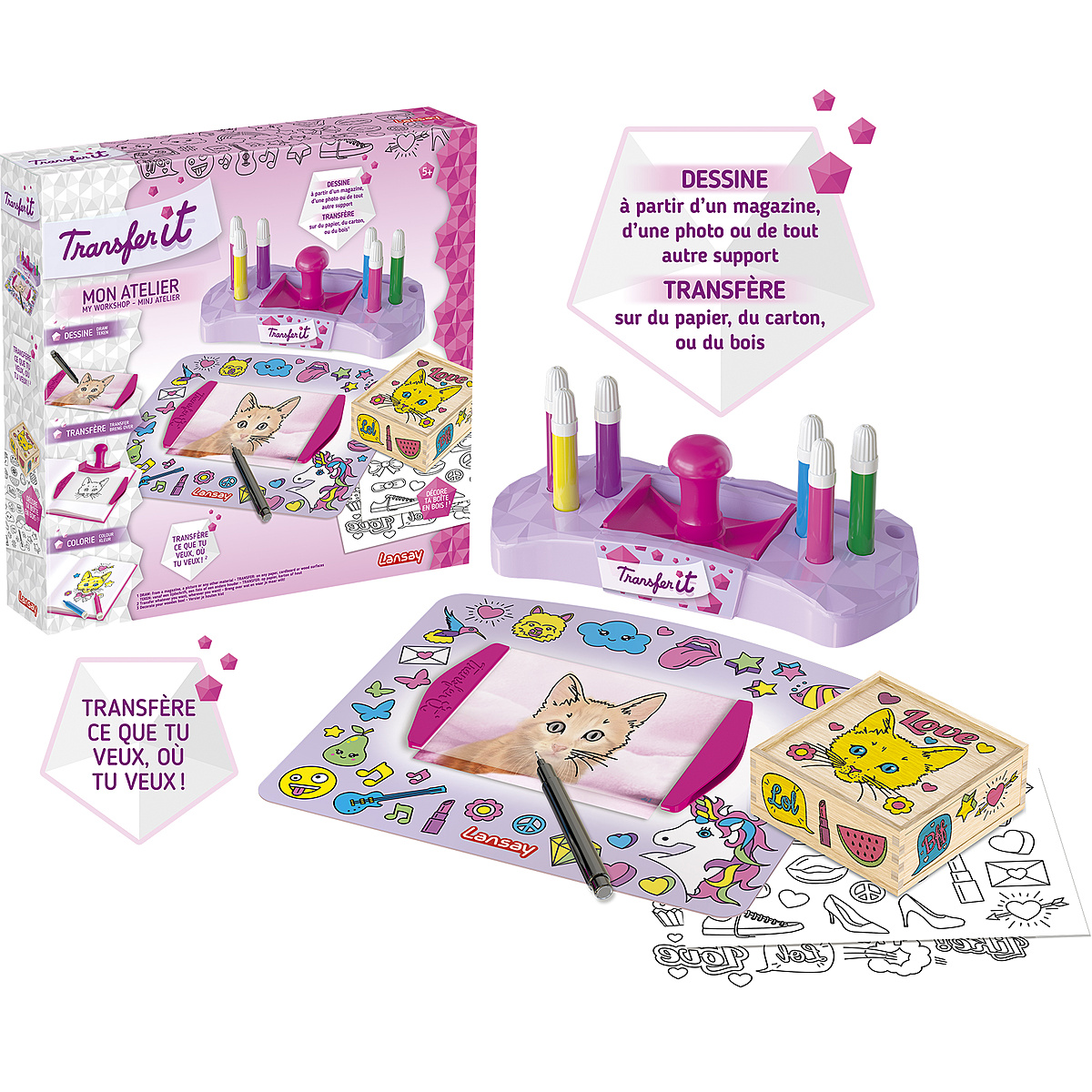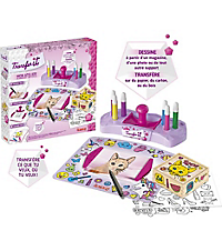 Transfère ce que tu veux, où tu veux avec ton atelier Transfer It ! Sélectionne limage de ton choix, superpose ta feuille de transfert et dessine les contours. Retourne ta feuille de transfert, place-là sur le support de ton choix, et appuie avec ton tampon pour découvrir ta création ! Tu peux ensuite la colorier et impressionner tous tes amis ! Transfère tes dessins sur n'importe quelle surface en papier, en carton ou en bois, et finis par colorier ta création !