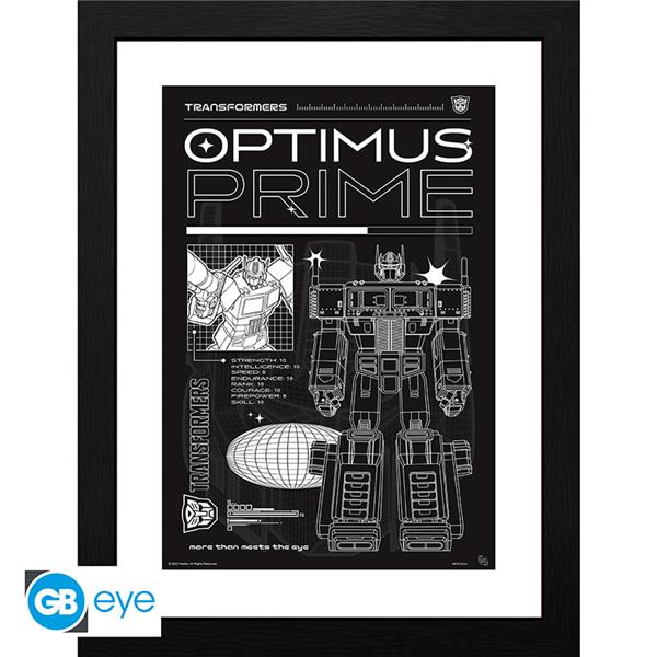 Mettez les données techniques d'Optimus Prime sur votre mur avec ce tirage encadré Transformers par GB eye. - Tirage sur papier photographique - Dimensions : 30,5 x 40,6 cm - Epaisseur du cadre : 25 mm - Vitre en styrène très solide - Packaging : film plastique avec plastique de protection sur les coins.