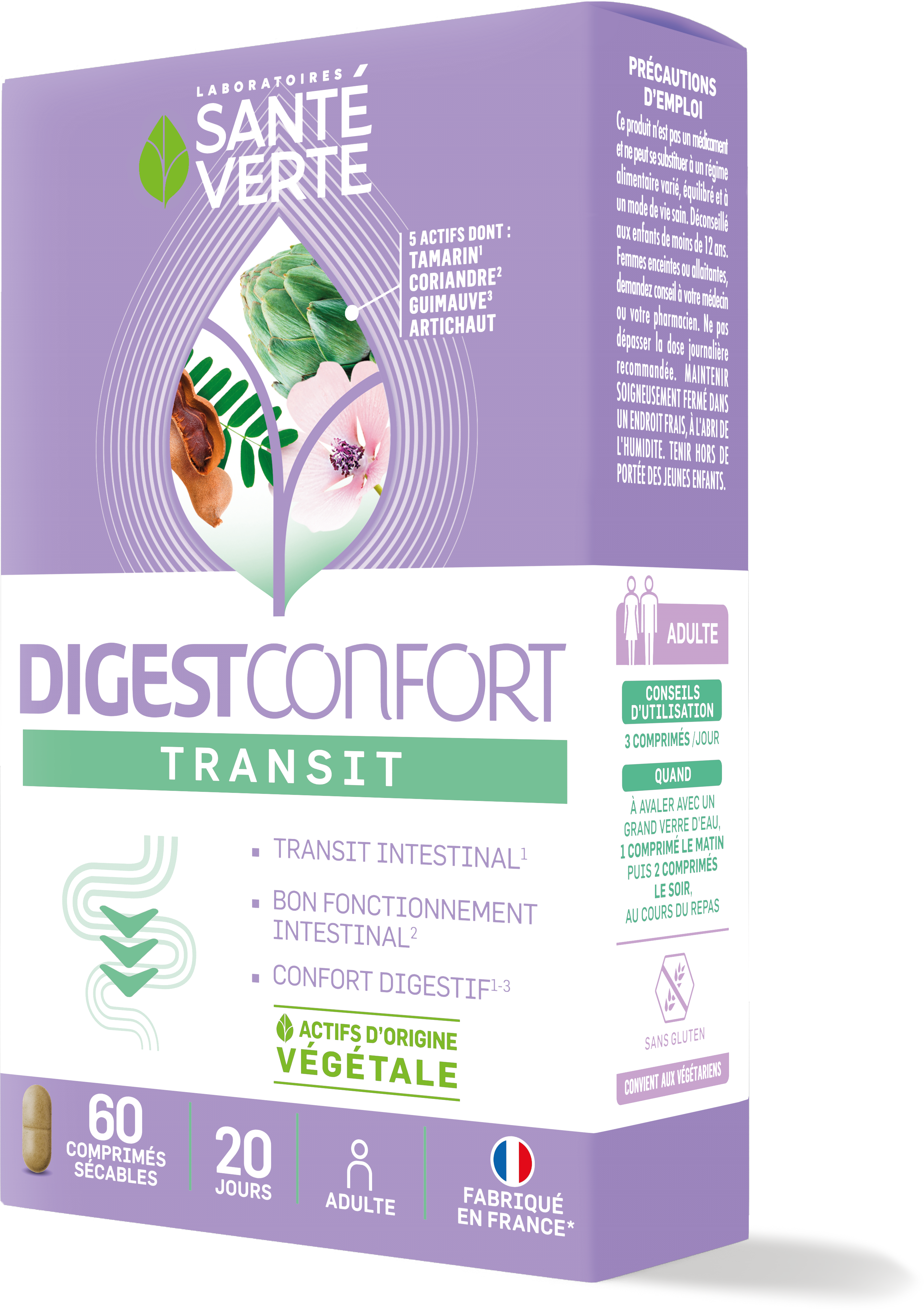 Transit 60 comprimés de Santé Verte est un complexe d'actifs 100% végétaux, avec notamment du Tamarin qui contribue au fonctionnement normal du transit intestinal, du Pruneau ou encore de la Guimauve qui aide à soutenir la digestion.