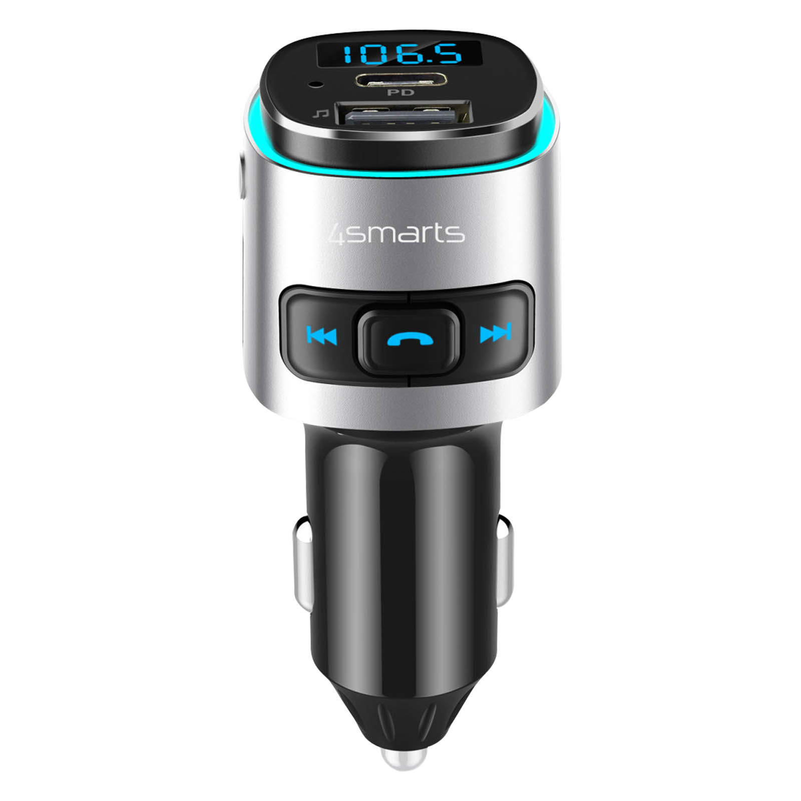 Transmetteur FM Bluetooth avec chargeur allume-cigare 4smarts. Connexion Bluetooth + entrée USB / carte micro-SD. Port USB-C avec technologie Power Delivery 18W + port USB. Kit main libre avec microphone. Boutons de commande. Rétroéclairage LED. Écran LCD