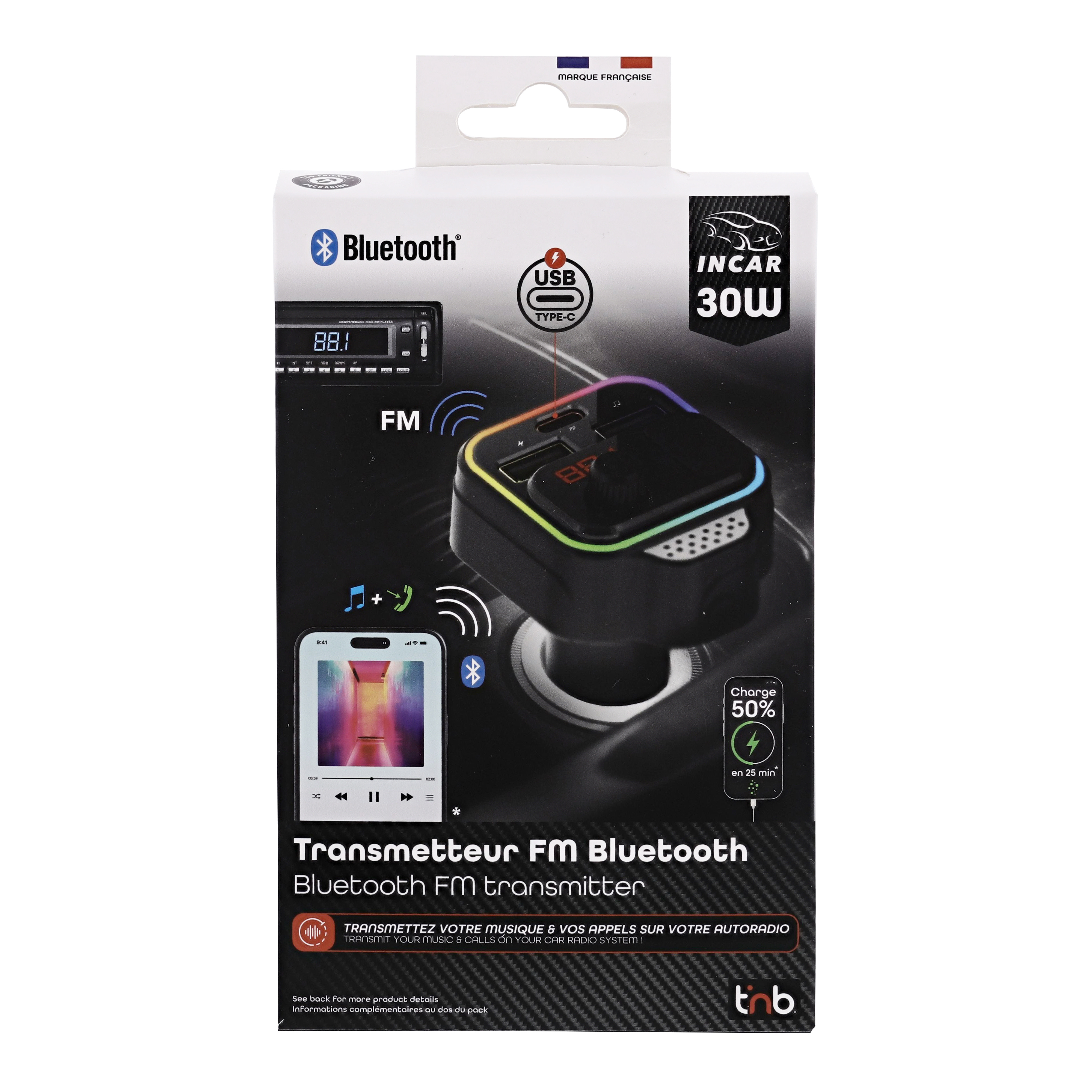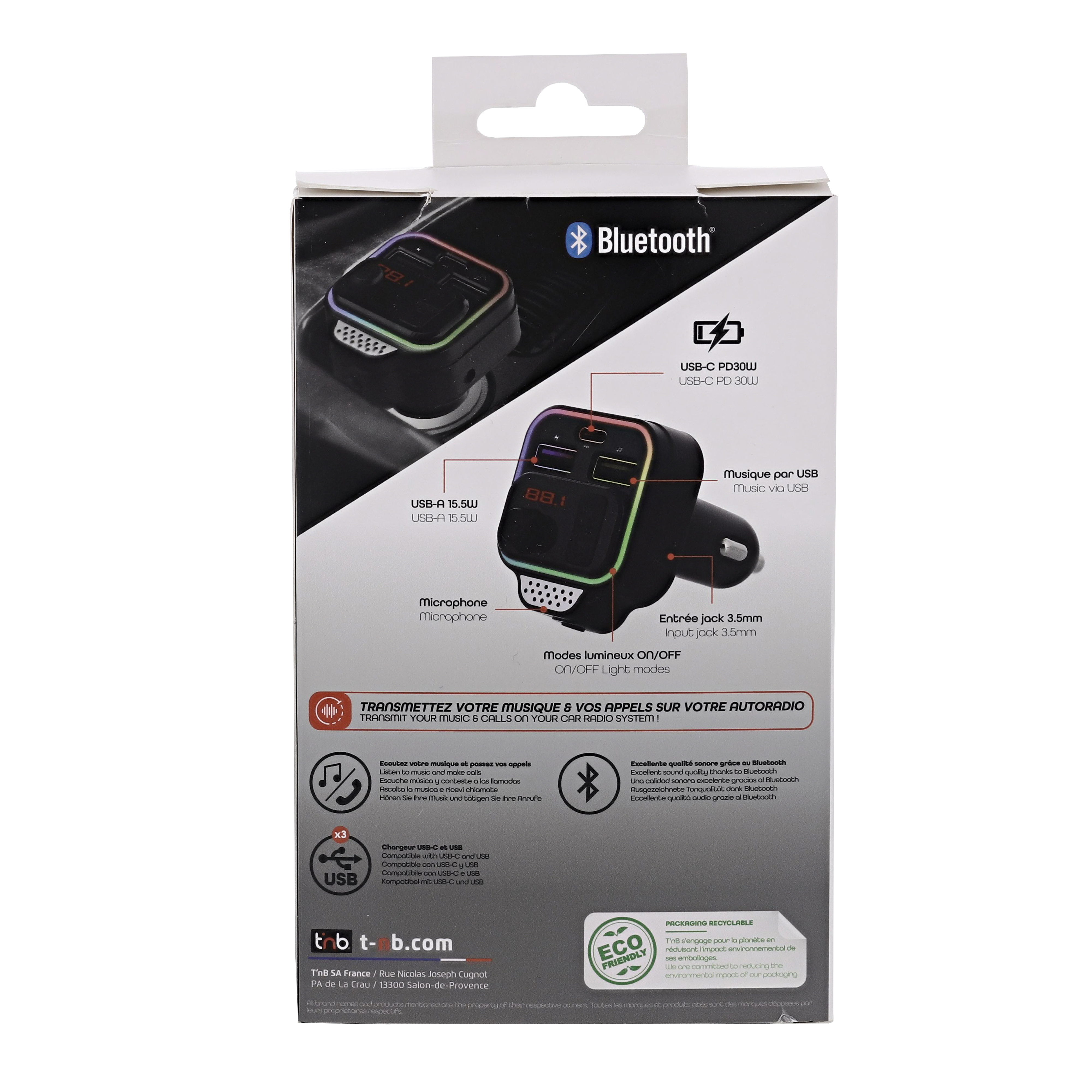Transmetteur FM Bluetooth kit mains libres et charge rapide Permet une écoute de la musique et des appels sur les haut-parleurs du véhicule - Gestion de la musique, du volume et prise d'appel directe via boutons intégrés - Branchement sur prise allume-cigares et appairage avec l'autoradio du véhicule - Fonction de recherche automatique des stations libres de droit intégrée - Connexion du transmetteur possible avec d'autres appareils via Bluetooth, jack 3,5mm, clé ou câble USB - Permet la charge d'un mobile en simultané via 2 ports USB dont un port USB 18W - Port de charge turbo USB-C 30W - Anneau de couleur lumineux réglable - Bluetooth 5.0 - Clé USB 64G max - Coul. noir